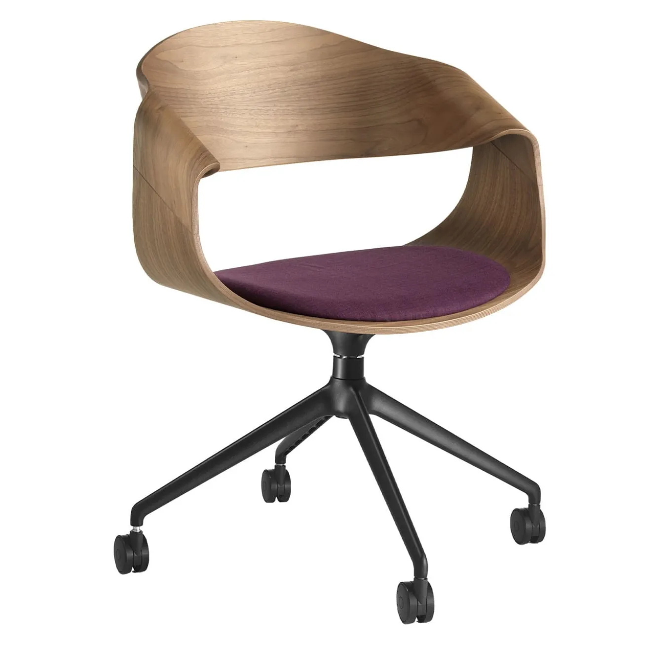 The Chantal chair features a walnut Canaletto shell and a metal four-star base with castors. The rich walnut shell provides a touch of sophistication, while the metal base with castors offers both style and mobility. Perfect for modern interiors, this chair combines elegance with practical functionality, making it a versatile addition to any contemporary space.