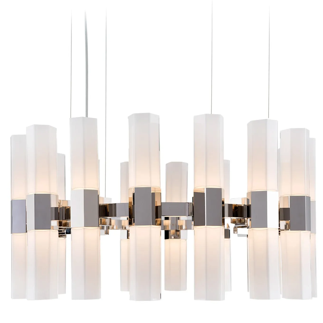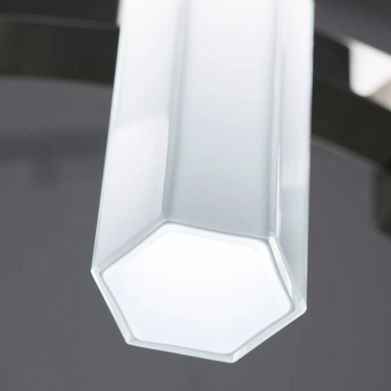 A calm chaos, elegant and composed. A stylistic system with structured tones where the real star is the hexagonal module. Its squared lines recount functional, aesthetic, and geometric storytelling. The name encompasses its most intimate essence: from a starting module, it can replicate myriad infinite forms, hence chaos. Led supplied. Bluetooth dimmer on demand. Available in custom sizes and finishes. Metal and blown glass. Polished nickel and hexagonal incamiciato white blown glass.