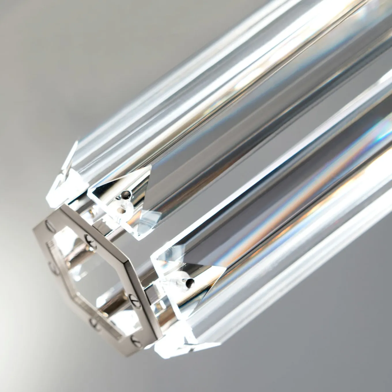 A calm chaos, elegant and composed. A stylistic system with structured tones where the real star is the hexagonal module. Its squared lines recount functional, aesthetic, and geometric storytelling. The name encompasses its most intimate essence: from a starting module, it can replicate myriad infinite forms, hence chaos. Led supplied. Bluetooth dimmer on demand. Available in custom sizes and finishes. Metal and crystals. Polished nickel and clear cut crystals.