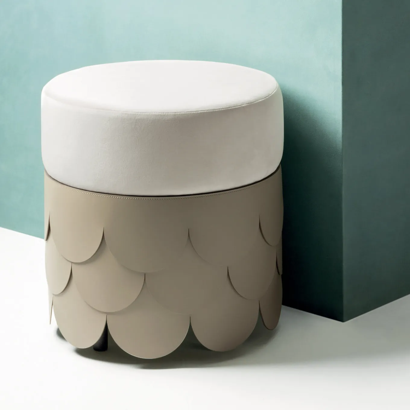 This beautiful, modern pouf is a unique piece that boasts a wood structure underneath, a white upholstered fabric cushion on top, and a beige scalloped skirt made from fine regenerated leather that has a water- and UV-resistant finish. This piece will be a perfect addition to any home or office space