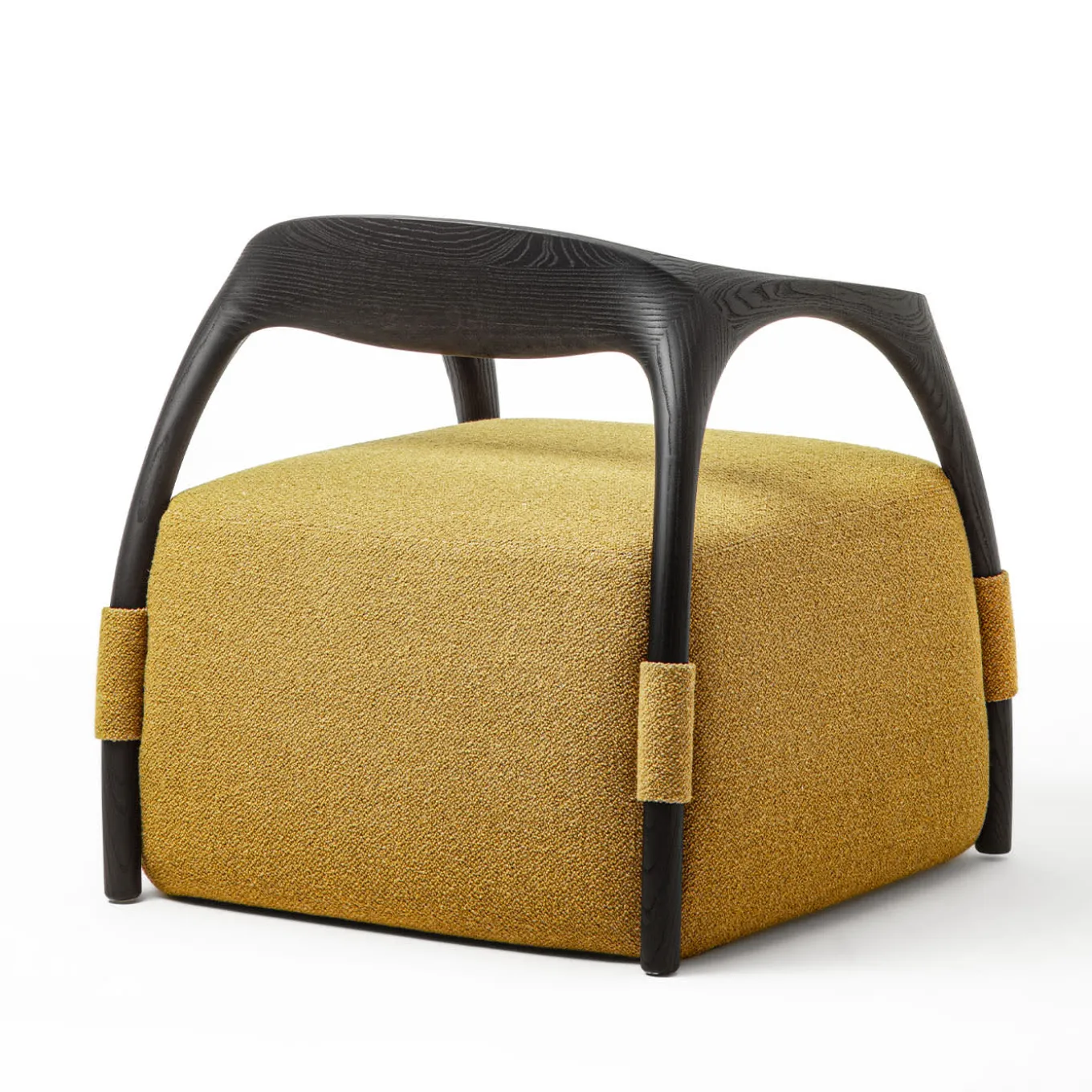 Characterized by a solid Black Ash wood frame and a luxurious seat upholstered in striking bright yellow fabric, this armchair embodies a blend of iconic design and meticulous craftsmanship. The slender armrests and meticulously arranged cut-outs enhance its airy sophistication, elevating its timeless allure. Available in various wood options and customizable with fabric or leather upholstery, this piece exemplifies versatility and elegance, effortlessly enhancing any space.