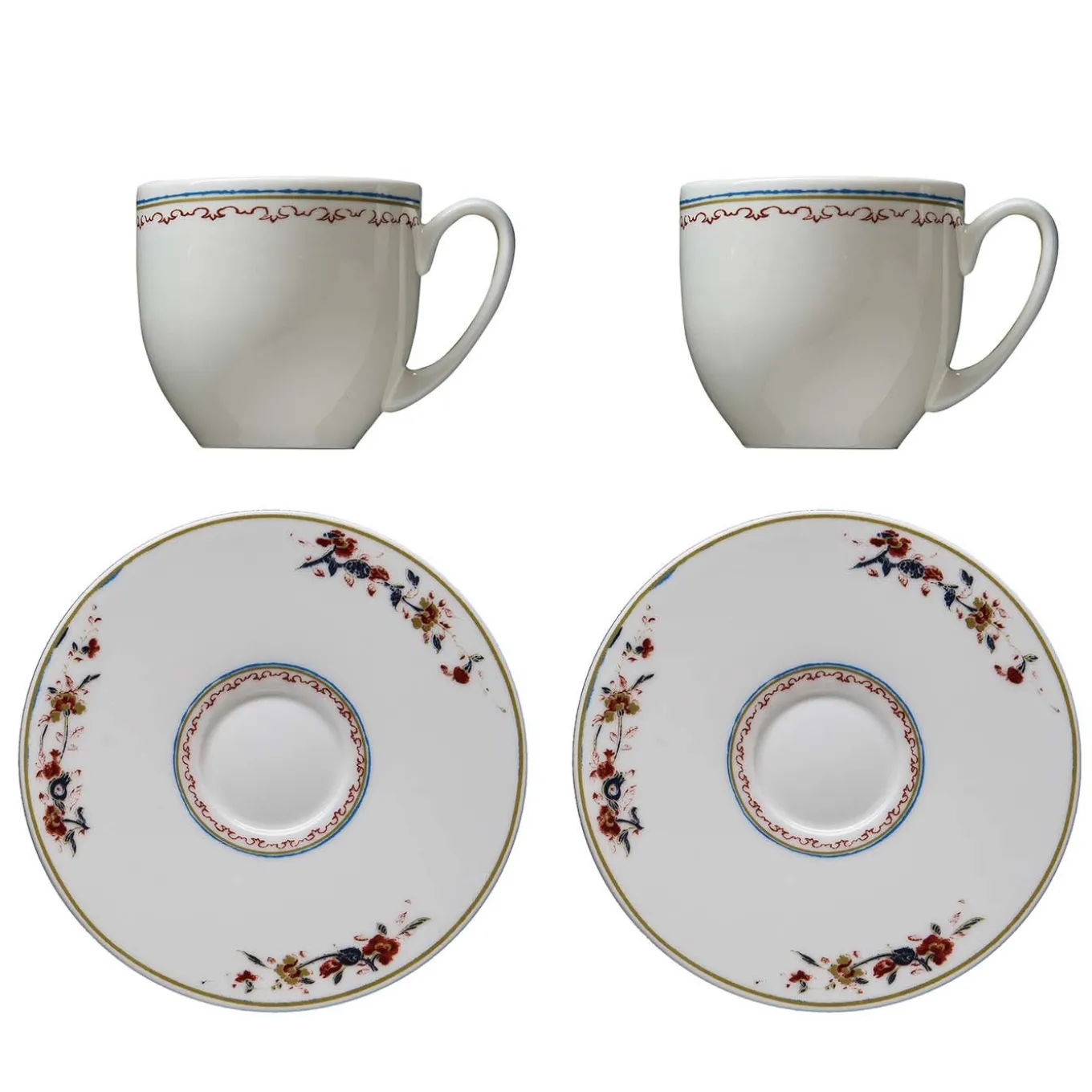 A sophisticated set to enliven an afternoon tea with friends, this porcelain cup and saucer from the Chinesi Fiori Finiti Collection is designed for a classical decor. Hand-painted orange-red, blue, and gold flowers inspired by the Japanese Imari motif dance along the three sides of the saucer, while the rims of both the saucer and cups are embellished with gold and blue double bands and thin scrolling. Comprising two teacups (210 ml) and two saucers (14.5 Ø cm), this set is a superb addition to a personal collection and a great gift for yourself or tea lovers. Comes in a signature gift box.