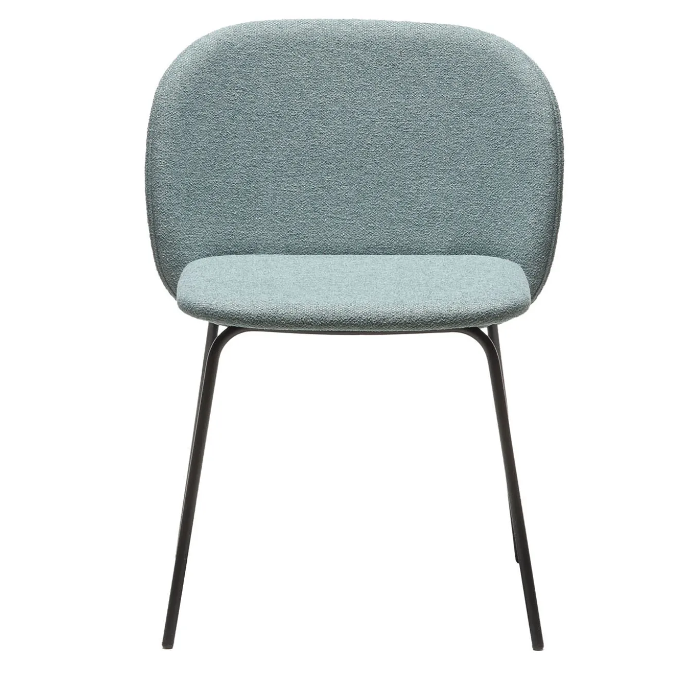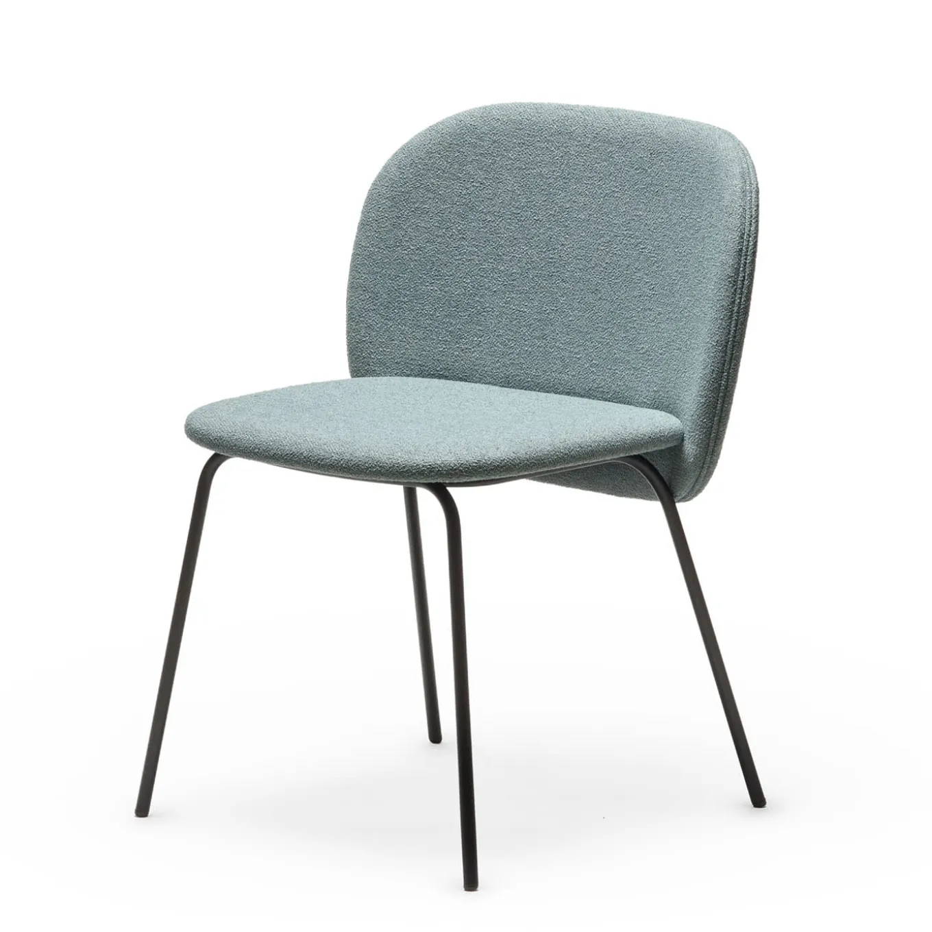 A chair featuring a black powder-coated steel frame, upholstered with fabric. Sleek and slick, the Chips collection is a true eye-catcher, with its unmistakably upbeat, trendy style. A set of chairs and stools, the back of which is, without doubt, their most iconic and characterizing feature. With its ample curves and generous size, it almost seems to transcend the limits of mere functionality, and by extending beyond the seat, it redefines its space in novel ways.