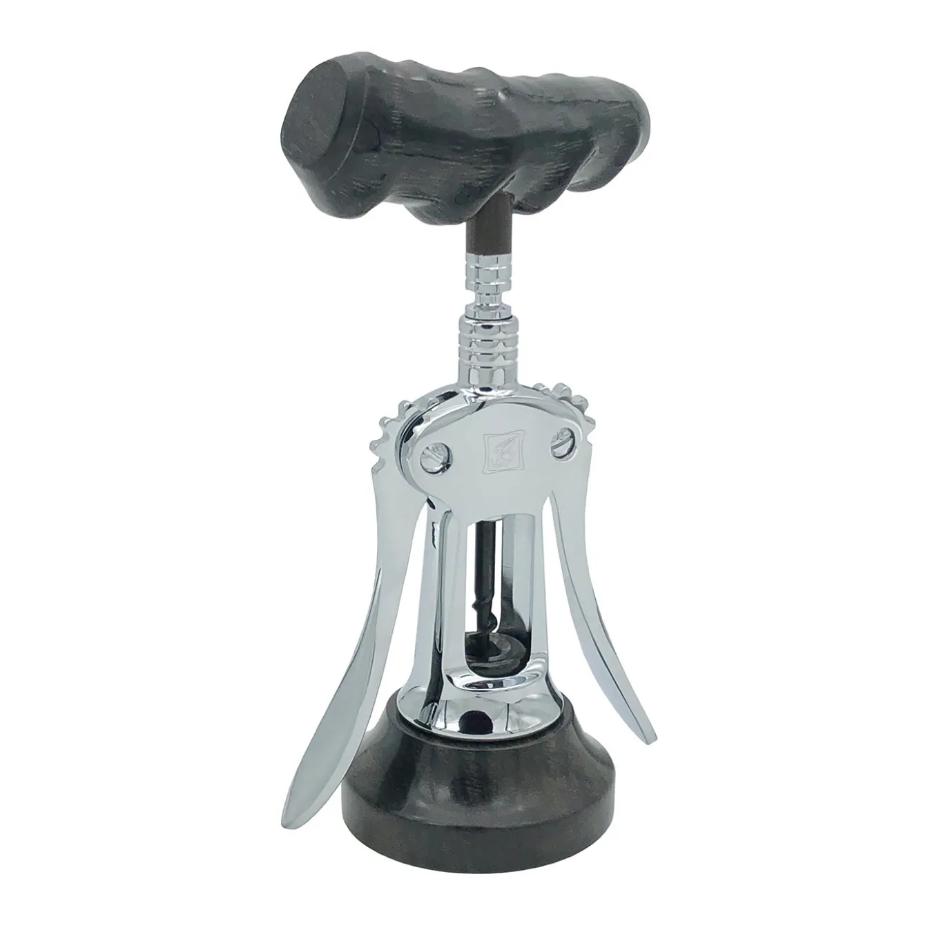 A timeless accessory in a bar cabinet and a well-received gift for wine connoisseurs, this brass winged corkscrew boasts a base of African ebony wood, whose dense black and finely-textured grains are complemented by a polished chrome finish. The genuine impala horn handle adds valuable and ornamental detail to this exclusive corkscrew.