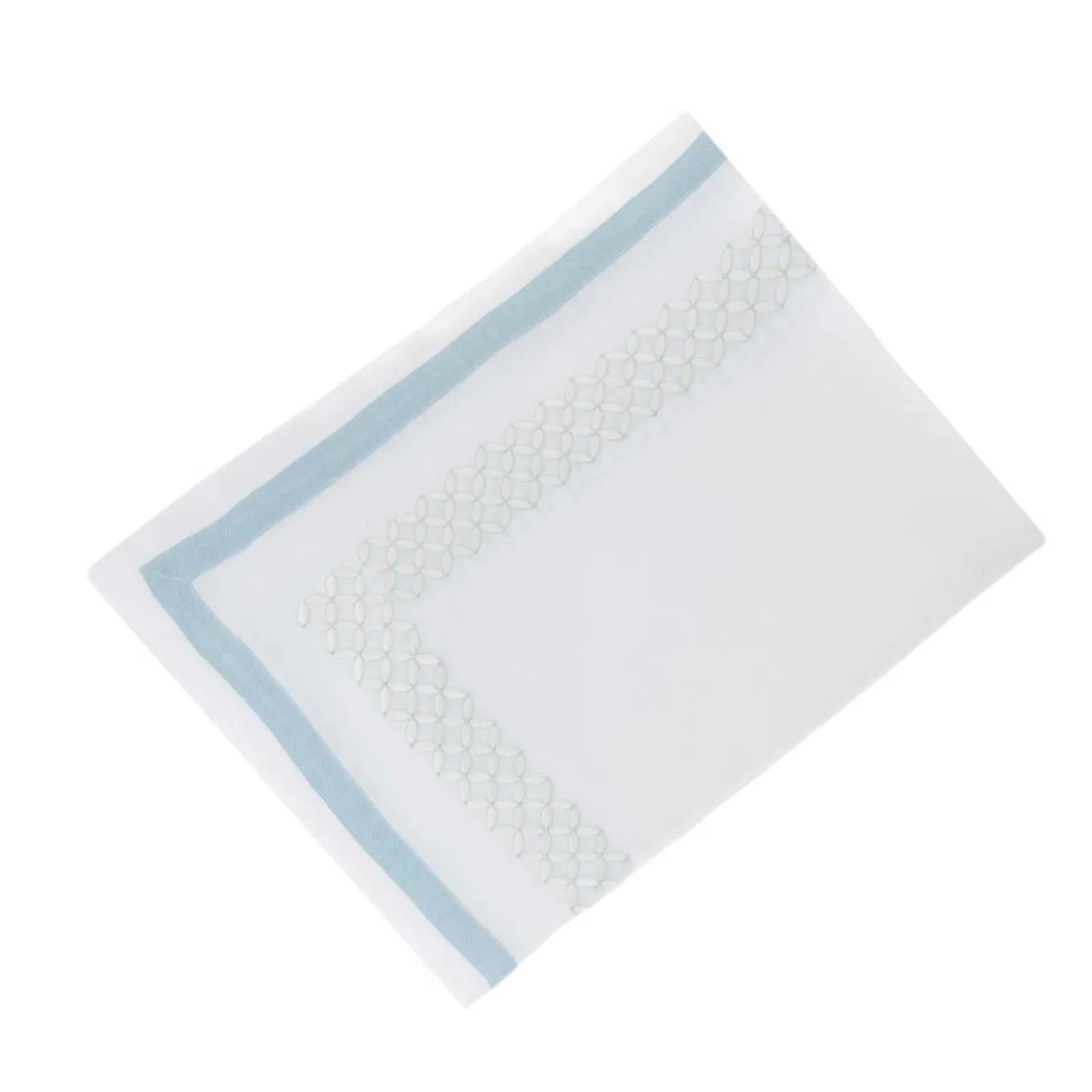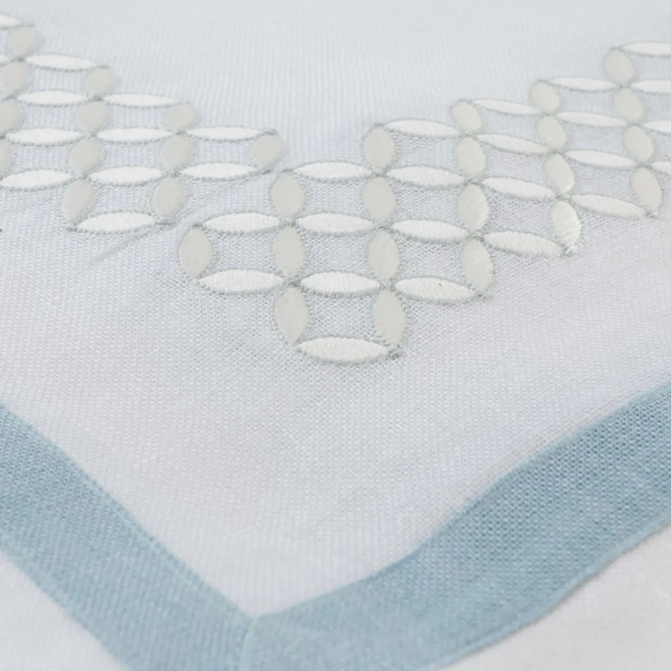 A stunning display of craftsmanship, this tablecloth is graced with a border made of a bold cerulean blue stripe framing a delicate floral motif. The exquisitely executed embroidery features two overlapping rows of floral motifs reminiscent of daisies. A charming choice that will transform any ordinary room into an elegant dining space fit for entertaining, thanks to its minimalist, chic look. Available in a wide selection of sizes please ask the concierge for details.