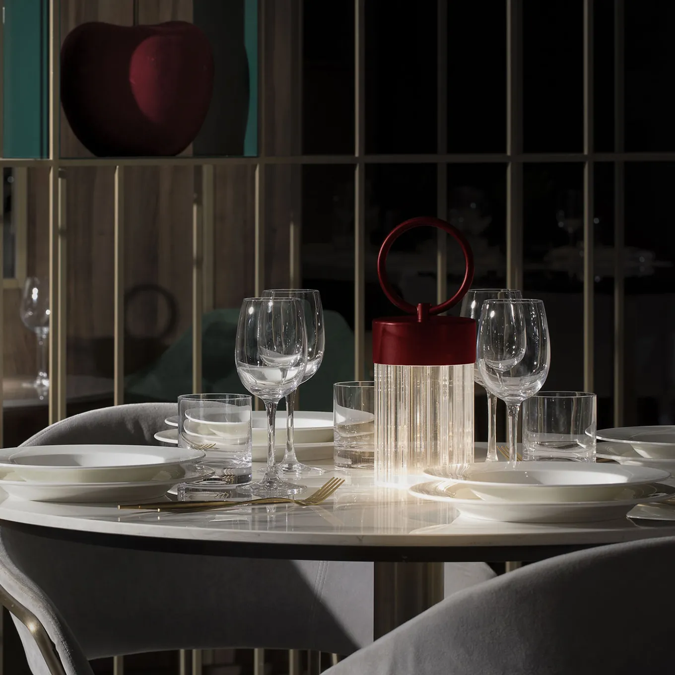 Designed by Chiara Caberlon, this refined portable lamp combines elegance with modern functionality. The deep red frame adds a bold yet sophisticated touch, while the ribbed diffuser creates a delicate play of light. Certified “CE” for quality and safety, it offers versatile illumination for any space, perfect for contemporary interiors seeking a stylish and distinctive accent.