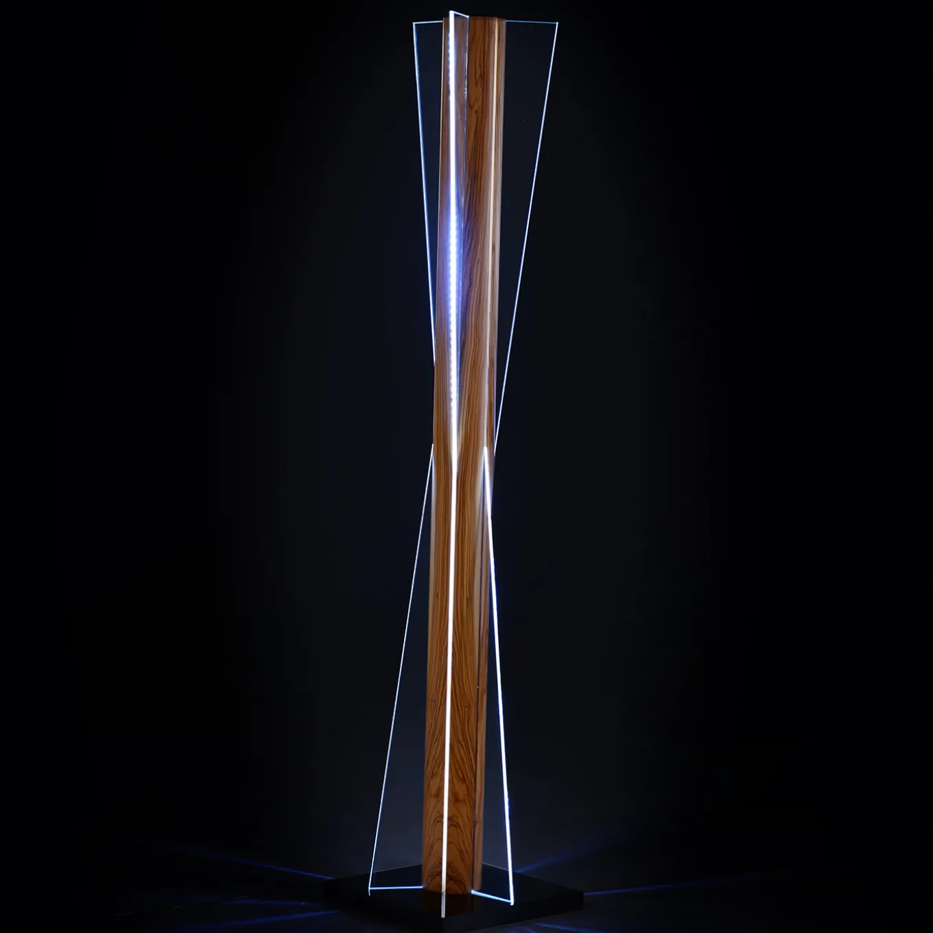 This elegant floor lamp evokes the silhouette of an hourglass, the ancient symbol for time, combined with an olive wood structure, which represents nourishment, tradition and life. Its design is both modern and classic, for a unique elegance and style. Made from olive wood, parapan and tempered glass. White LED light. Part of the company’s Carpentry Collection.