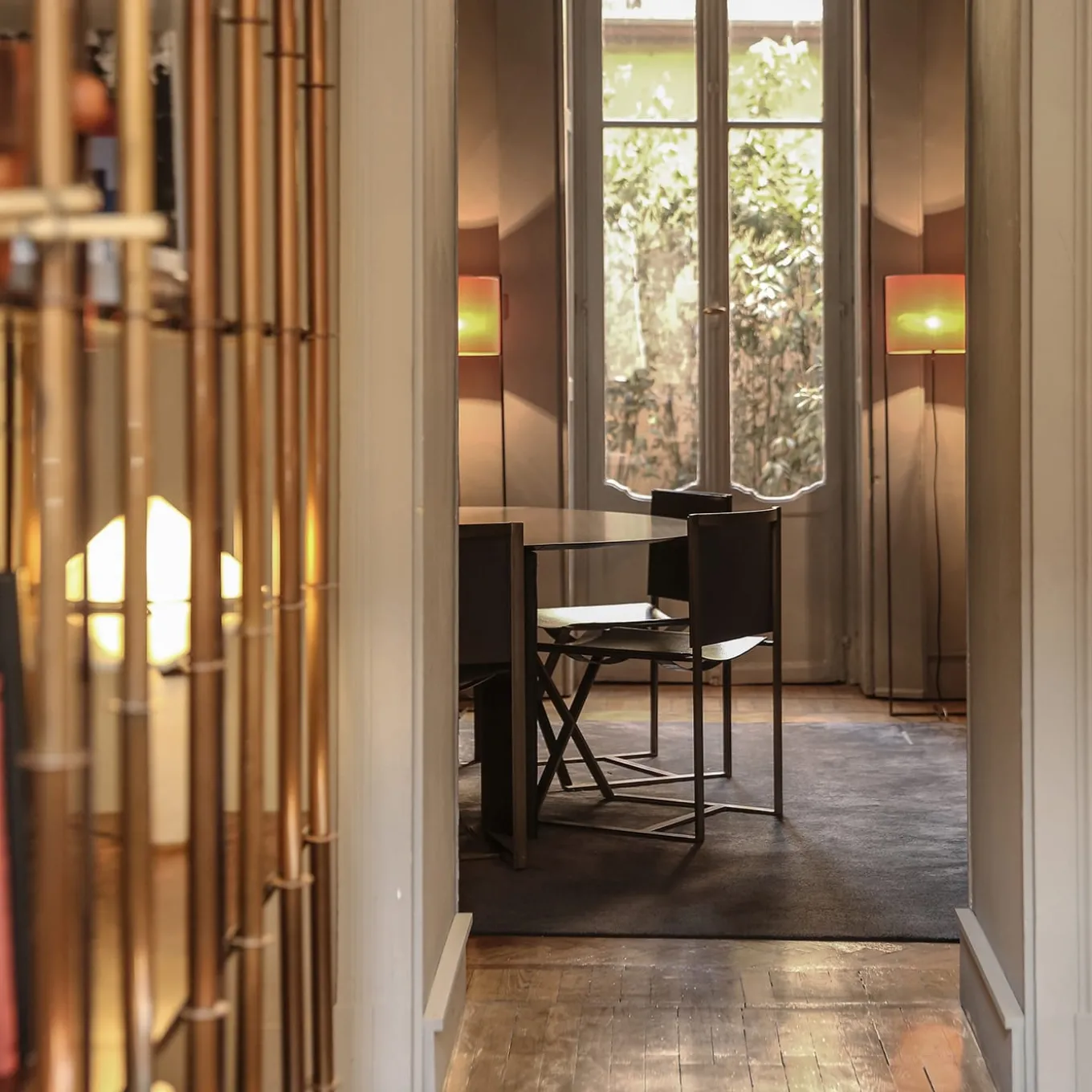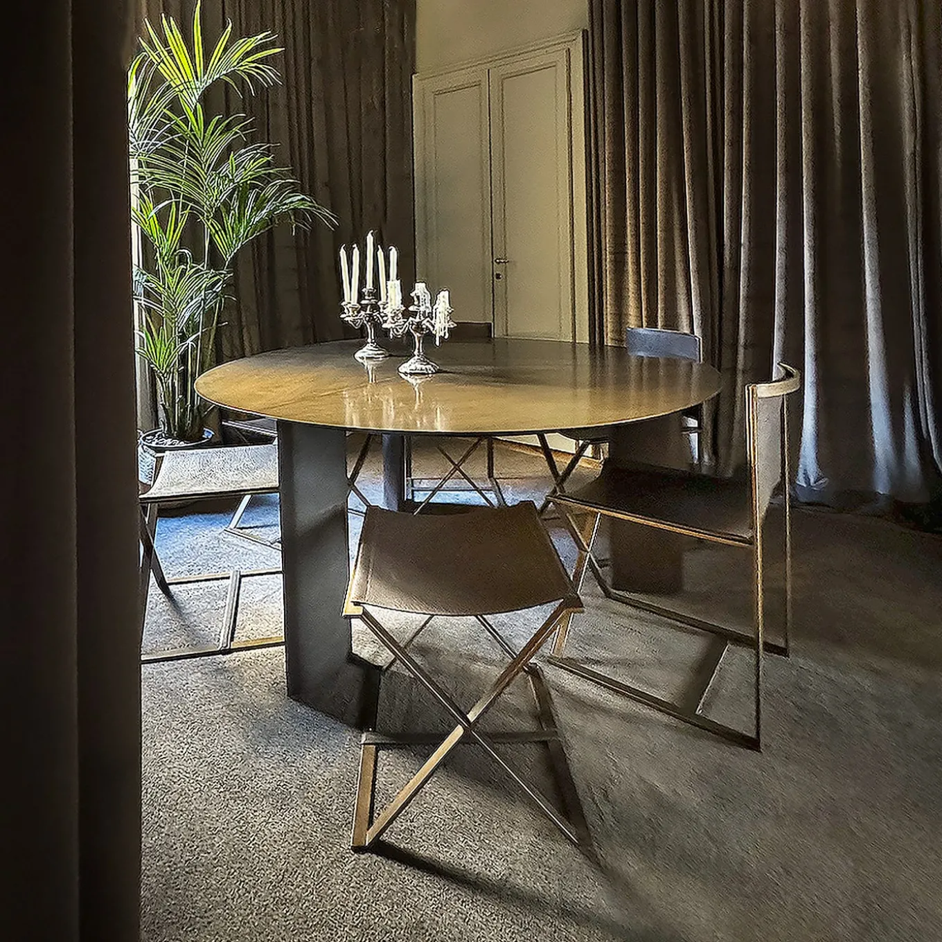 Chair with a galvanized structure featuring a burnished brass effect. The leather of the seat and backrest has a textured finish, enhancing its scratch resistance. The leather upholstery is reinforced to ensure it retains its shape over time.