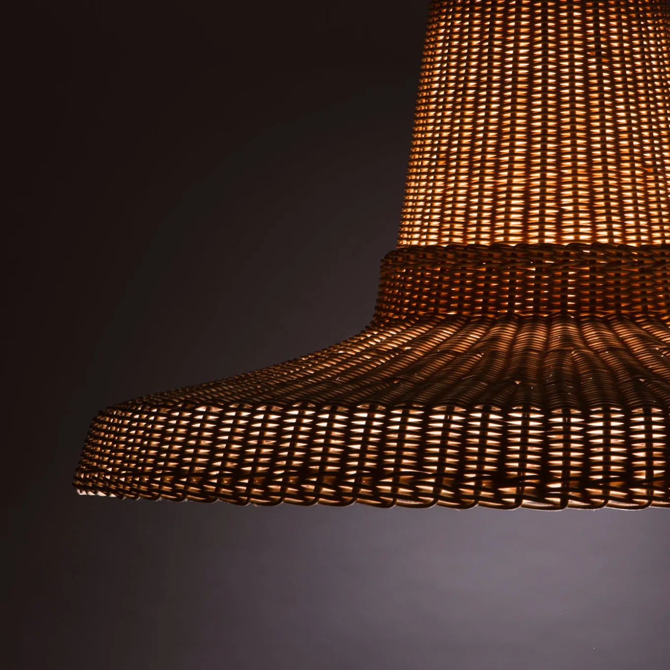 This pendant lamp features three interlocking parts made of natural woven wicker. Its shade, crafted with up to 135 meters of wicker in a classic weave, has a large circular segment that interlocks with a small cone for the Mini version or a double trunk for the larger version. When off, the shade highlights the woven design; when on, it reveals the light source through the weave. It is available in Terra and Miele colors, please contact concierge for further details.