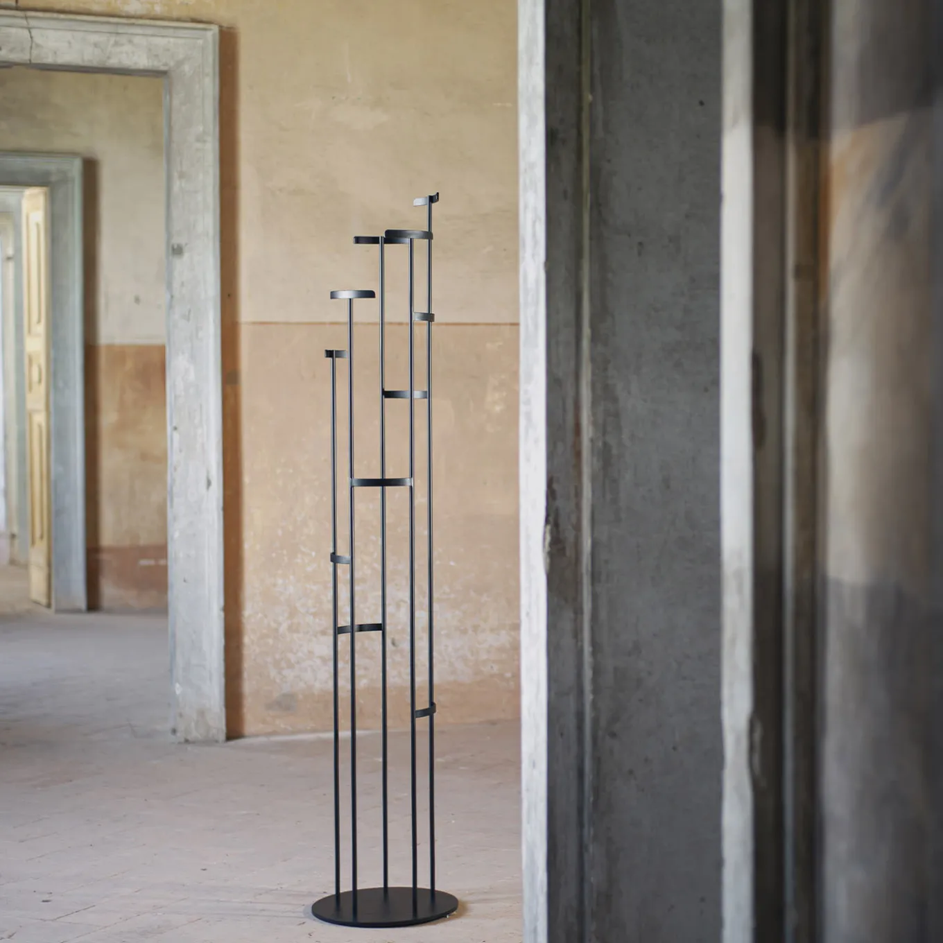 Designed by Svetlana Golubeva, this stunning coat hanger is a sculptural piece that embodies the perfect union of aesthetic and functionality. Sturdy yet lightweight, its minimalist, captivating silhouette is fashioned of black-lacquered iron and is composed of a series of vertical stems topped with horizontal, slightly curved ends.