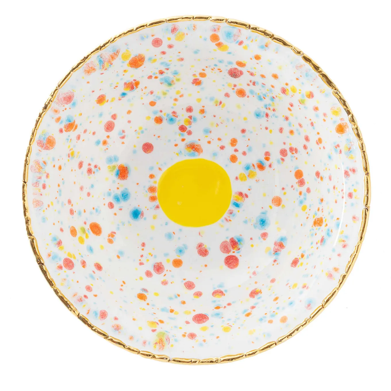 This elegant large salad bowl is part of the Confetti collection and can be combined with other items in the same series for a cohesive look, or used alone as serving plate or centerpiece. Its flaring silhouette was crafted entirely by hand of porcelain and features a series of yellow, red, and pale blue dots that enliven the interior and exterior of the piece. The exquisitely crackled rim is a unique accent that was highlighted by gold leaf for a dramatic effect.