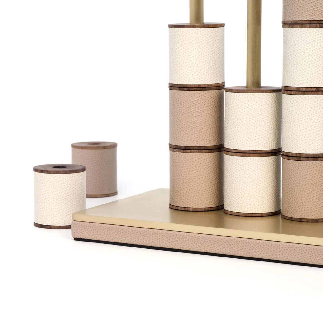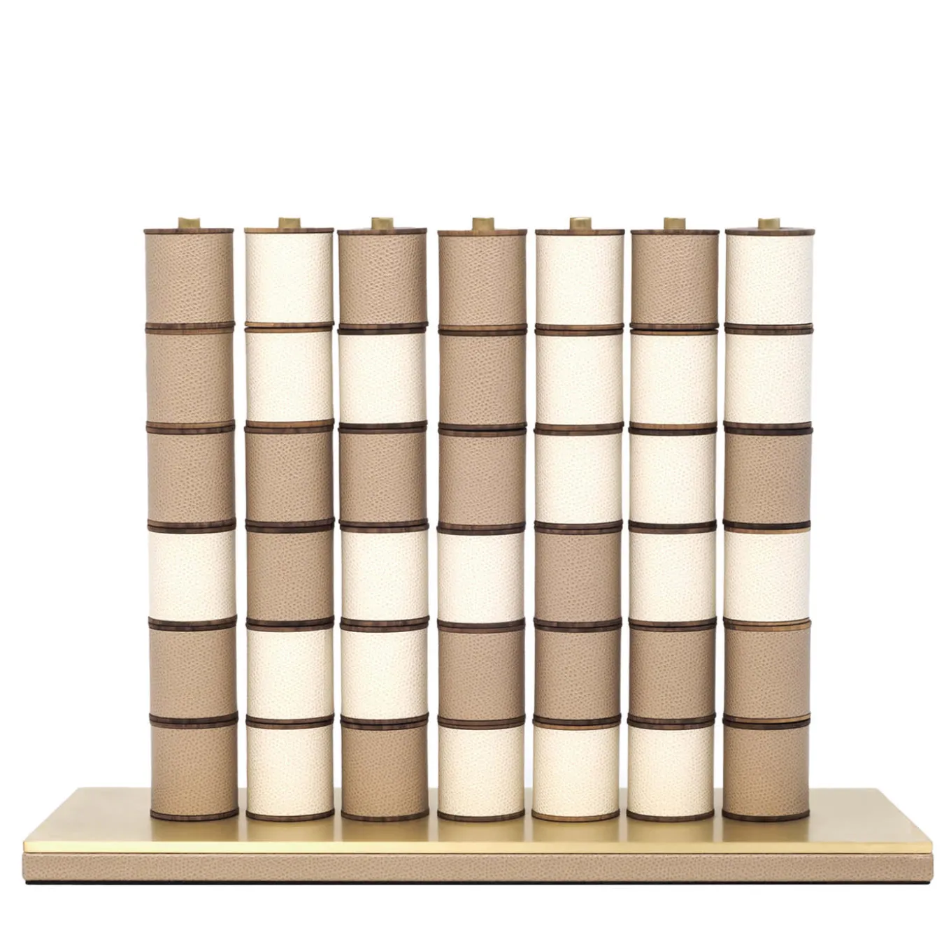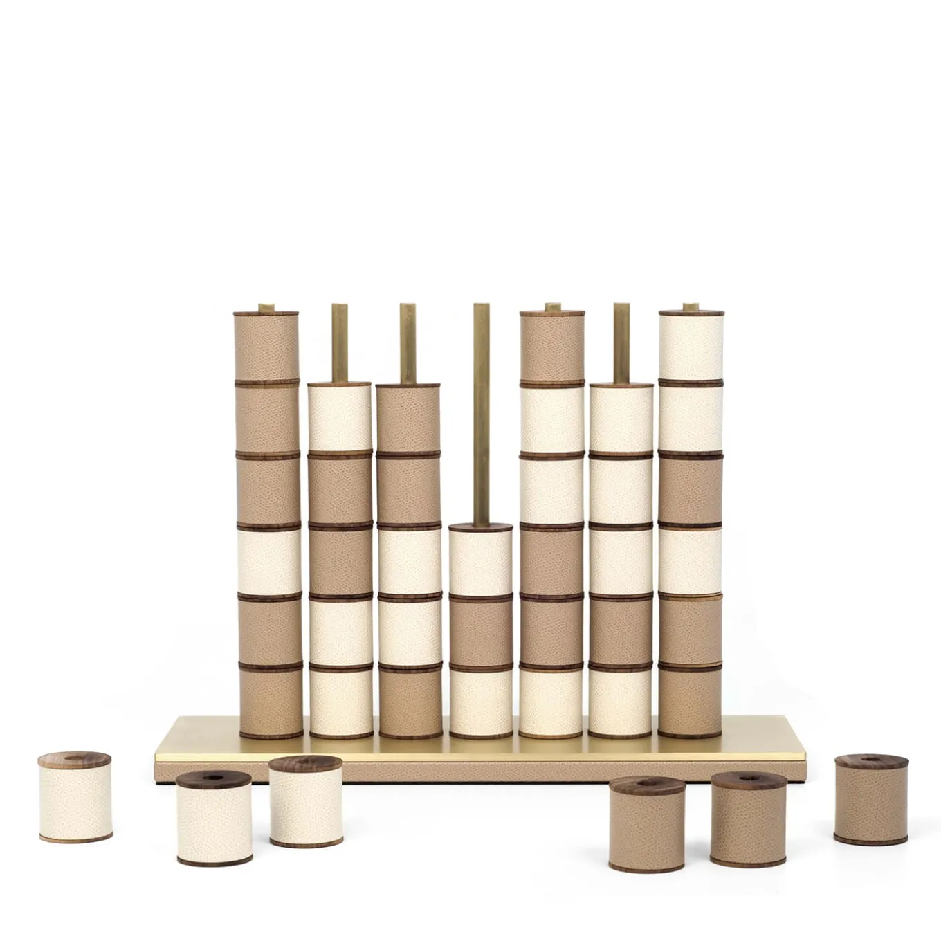 The ideal gift with a refined aesthetic, this board game includes a wooden base covered in leather with a satin brass top and seven vertical brass bars. The 42 disks are in Canaletto walnut covered in white and beige leather (21 of each color). This piece is entirely customizable.