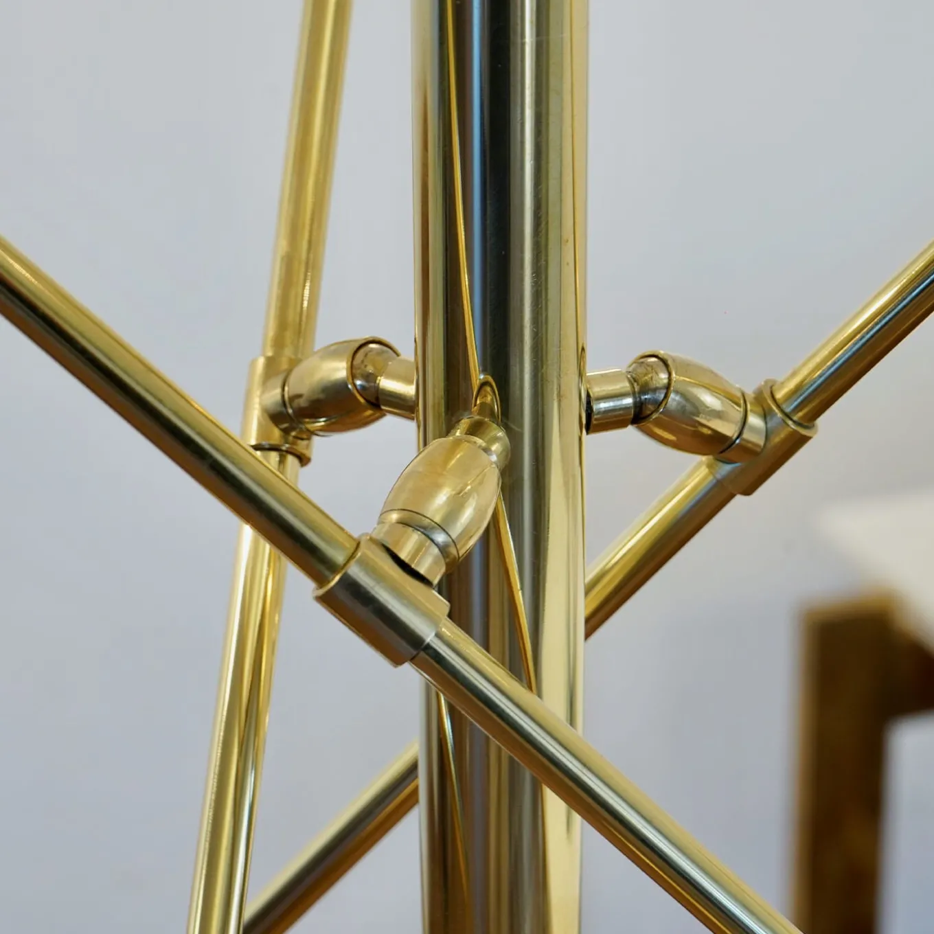 The Contrappeso Terra Brass Floor Lamp combines modern design with functional elegance, featuring a distinctive three-arm configuration that reinterprets the iconic midcentury Triennale lamp. Adorned with twin Giano shades, this lamp showcases a total of six lights, skillfully designed to provide both task lighting and ambient illumination. Each arm is meticulously crafted from natural solid brass, ensuring durability and a luxurious finish. The integrated brass cast counterweights, finely calibrated with sand, guarantee perfect balance, allowing for effortless adjustability of the arms. This thoughtful design balances aesthetics with performance, making it an ideal addition to various interior spaces.