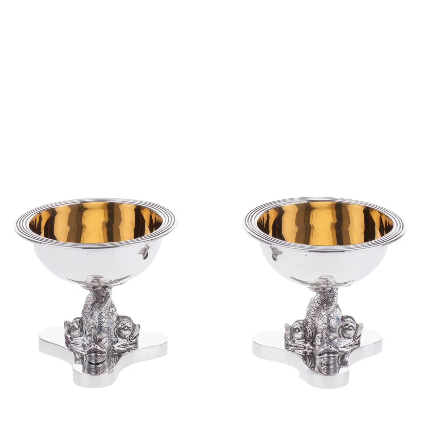 This is a pair of sterling silver salt cellars with a gold-plated interior by Florentine Silversmiths Pagliai. Modeled on a late 18th-century Venetian original, each cup is supported by three richly-detailed fish making up the stem.
