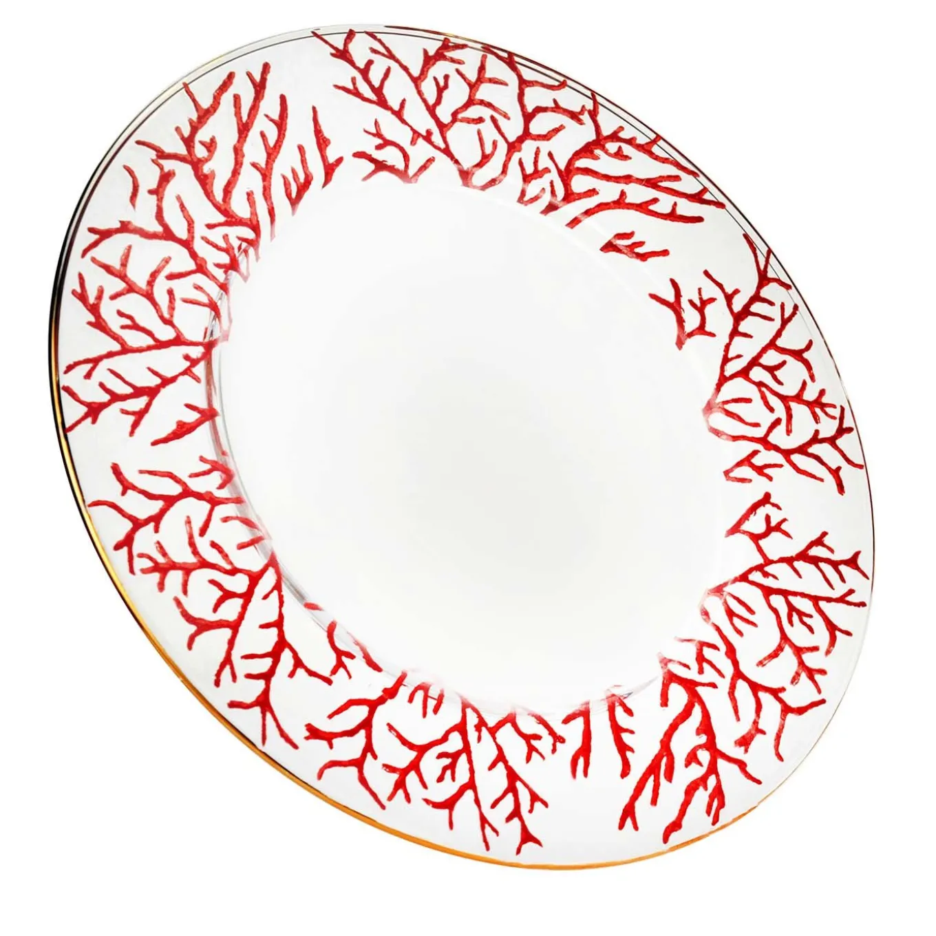 This charger plate is a lively and refined objet d’art that will make a striking statement when matched to the other pieces from the same series. Exquisitely handcrafted of glass, it is enriched with a handmade decoration of a coral stem, golden colored rims and a refined, golden-finished shell.