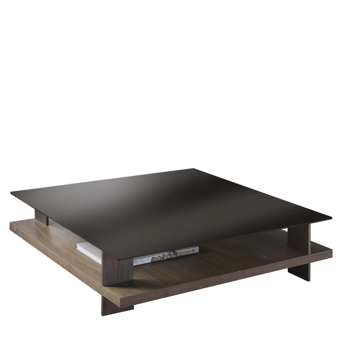 Part of the Corallo collection, this square coffee table is both functional (because it provides two visible display surfaces) and decorative (thanks to its solid yet harmonious silhouette and the use of natural materials). The upper top is in transparent-bronzed glass and is supported by a wooden structure with a Canaletto walnut veneer that comprises a lower top pierced by the four vertical legs. The aluminum details also boast a Canaletto walnut veneer. This piece is also available with clear glass top and wenge or black stained finish, please inquire with the Concierge.