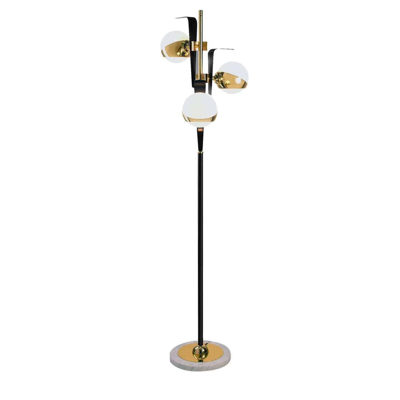 Incredibly sleek and refined in its linear design, this stupendous floor lamp will take center stage in a refined contemporary interior. Fashioned of black and gold-lacquered brass, it rests on a white marble base and features three stunningly luminous spherical shades. Please inquire with the Concierge for further details on materials.