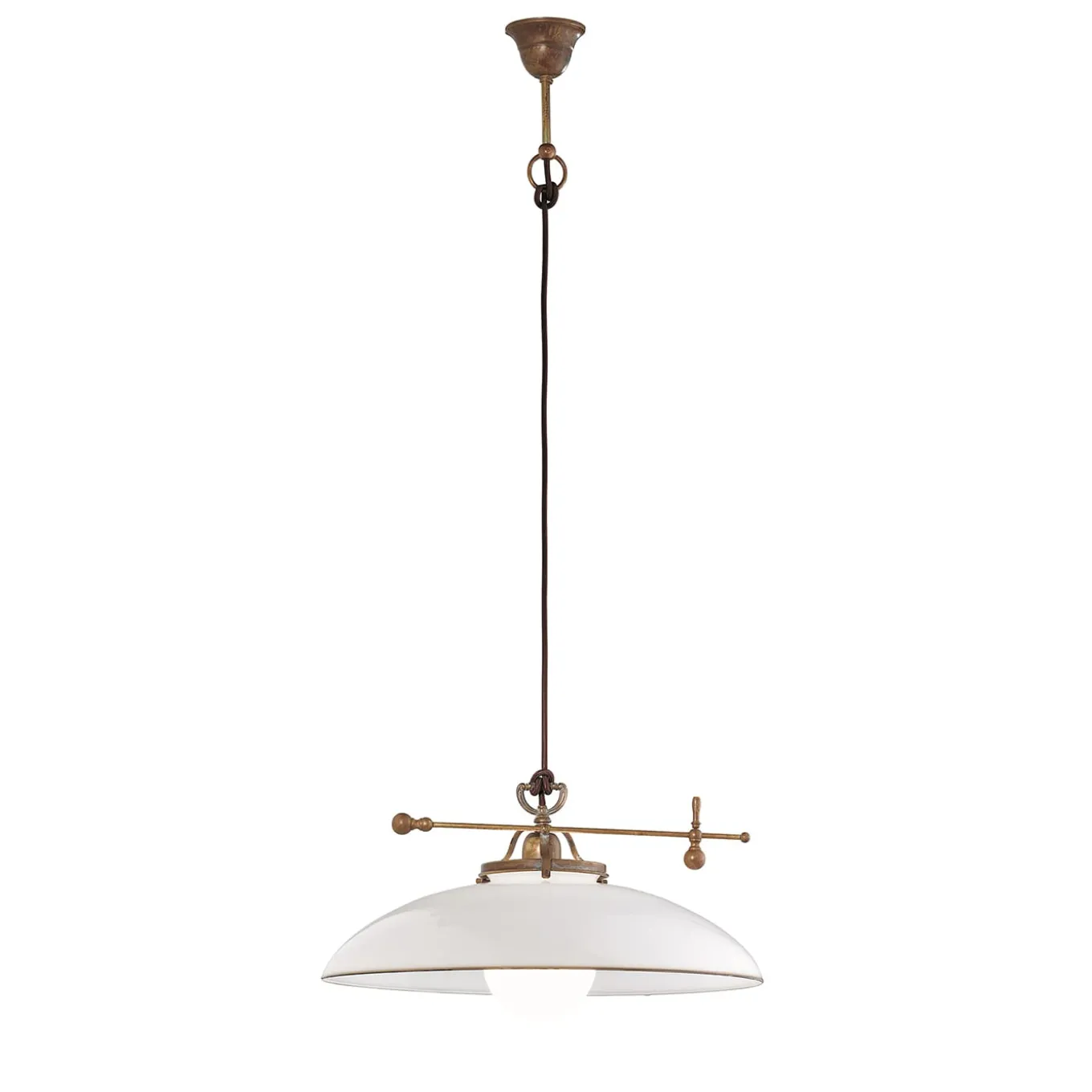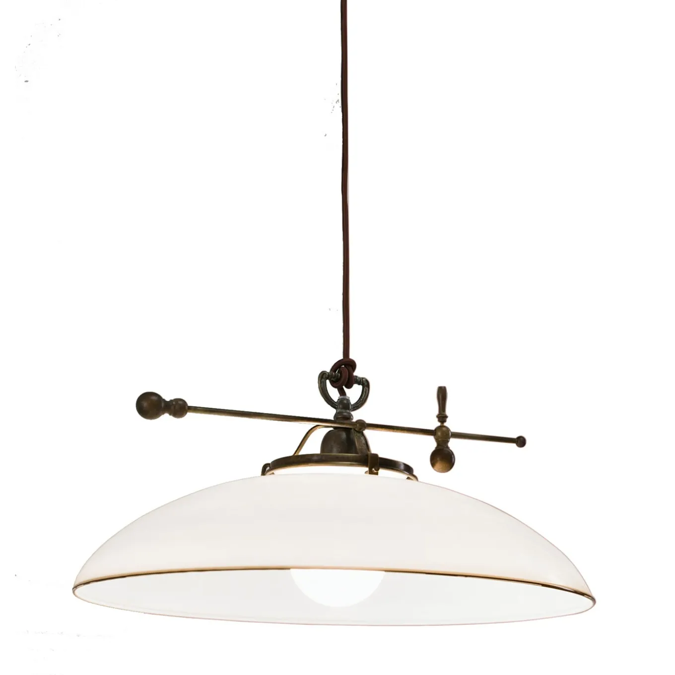 Country style and the age-old tradition of Murano glass, a fine expression of Made in Italy, come together to perfection in the Country lamp collection. Made of brass and white blown glass, they feature a burnt brown rim and an antique brass finish. The collection consists of a wide range of items, from pendant lamps to wall lamps, in different versions and sizes.