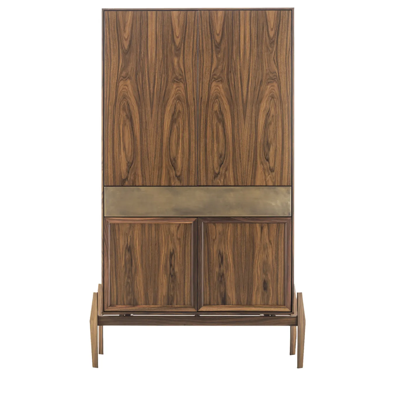 A tribute to the Italian design of the 1950s, the Crab collection is characterized by pieces with a unique supporting structure that can be rotated to change the height of the cabinet (in this case from 162 to 171.5 cm). The base is made of solid rosewood, while the rest is made of veneered wood. This tall cabinet features a satin-finished drawer that separates the two 2-door units: the larger on top has smooth panels with soft-closing hinges while the bottom has smaller recessed panels. Shown at Salone del Mobile 2018, this piece is the ideal choice in any living or dining room to add storage without compromising quality and style.