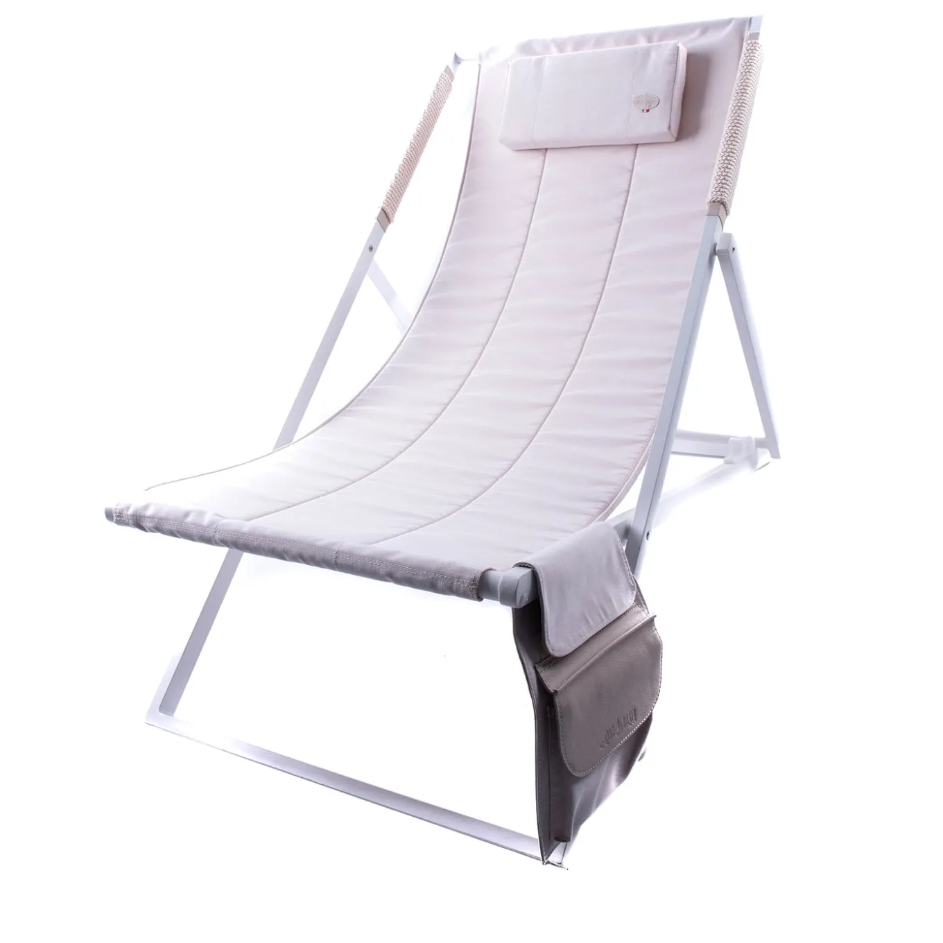 An exquisite modern design that will effortlessly complement any outdoor area, this deck chair belongs to a refined series distinguished by a practical side pocket to store small objects such as sunglasses, sunscreen, or a book. Handcrafted of white sandblasted aluminum, it features a fabric seat with a headrest. Please contact the Concierge for more details and customization options.