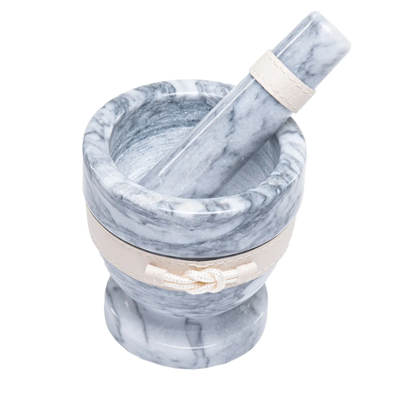 This precious kitchenware accessory in prized marble will bring to mind relaxing offshore atmospheres with its nautical-style rope knot adorning the cream leather band that is wrapped around the mortar. Paired with its coordinated pestle, it makes for a superb addition to pantries. The use of a natural stone implies the uniqueness of every piece. Other color options are available, please ask the Concierge for details.