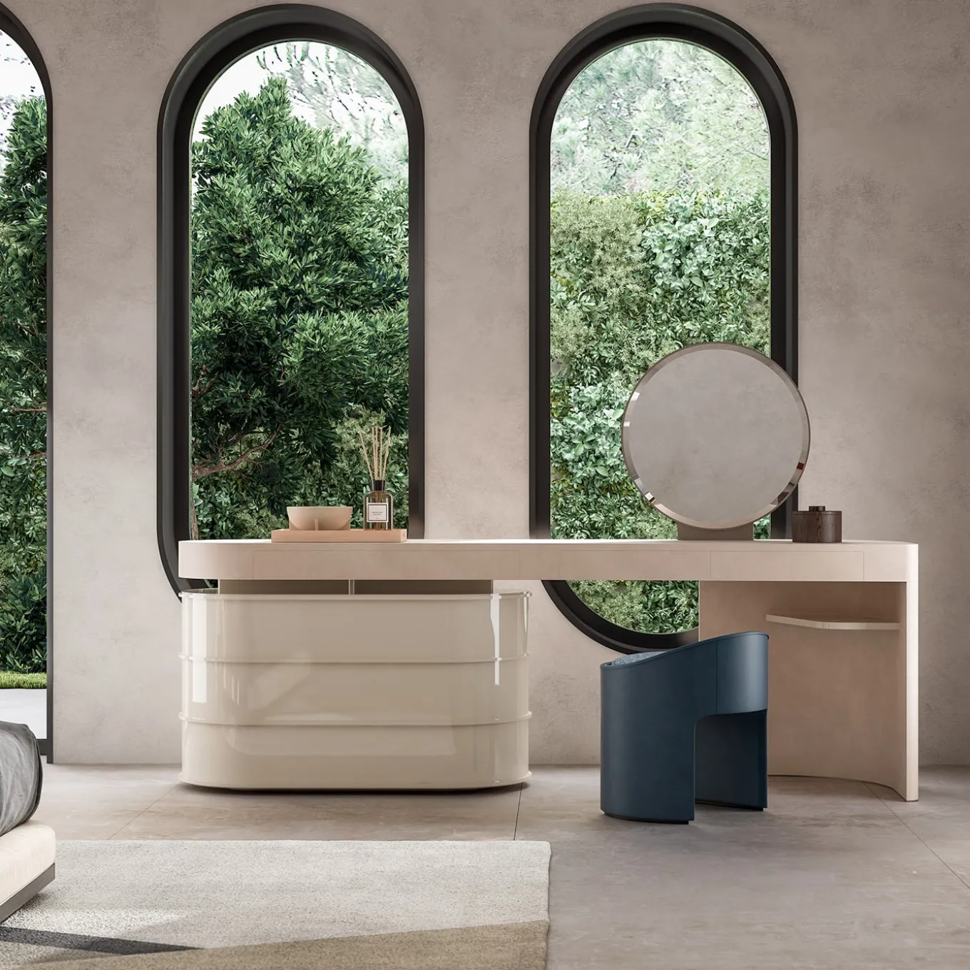 In the design of this vanity desk, all the corners and the edges got round and beveled for receiving the light’s sapient game, for inspiring calm and serenity, and for stimulating social relations and conviviality. The shape is also essence: the usage of smooth lines, colors, and materials benefits our mind gifting us with personal spaces which can grant wellness to us and to the people we care about. Glossy lacquered structure. Top and side covered with leather.