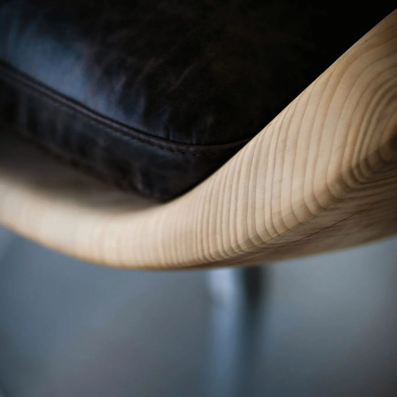 A painstakingly carved cedar shell marks this unique armchair, where modern and rustic influences coexist. Showcased in its natural grain and cracks, the structure is complemented by cushioned elements offering long-lasting comfort in both the seat and backrest. Its revolving design – also including a round iron base – suggests the piece as a clever addition to a private study.