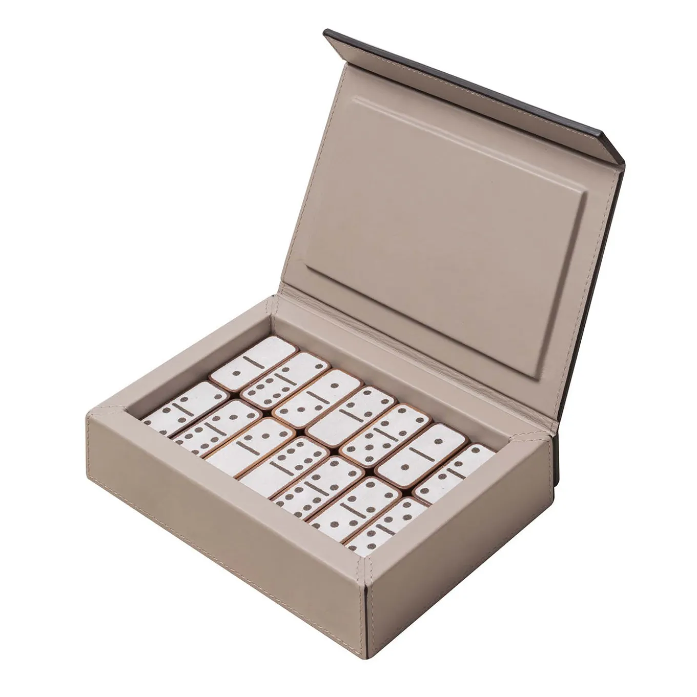 A one-of-a-kind collector’s piece, this splendid game box is furnished with high quality Bakelite dominoes. Elegant and refined, the case is crafted of wood and is upholstered with beige leather boasting a stunning decoration made of woven leather and horsehair. Marked by a magnetic closing system, this piece is available in other colors upon request.