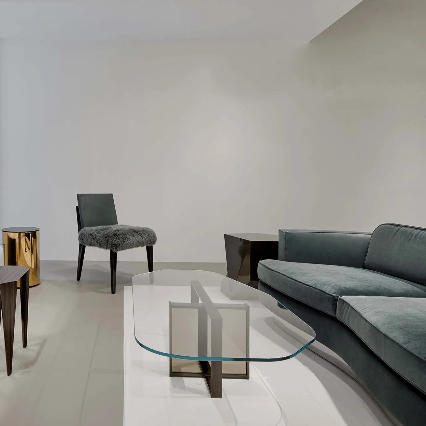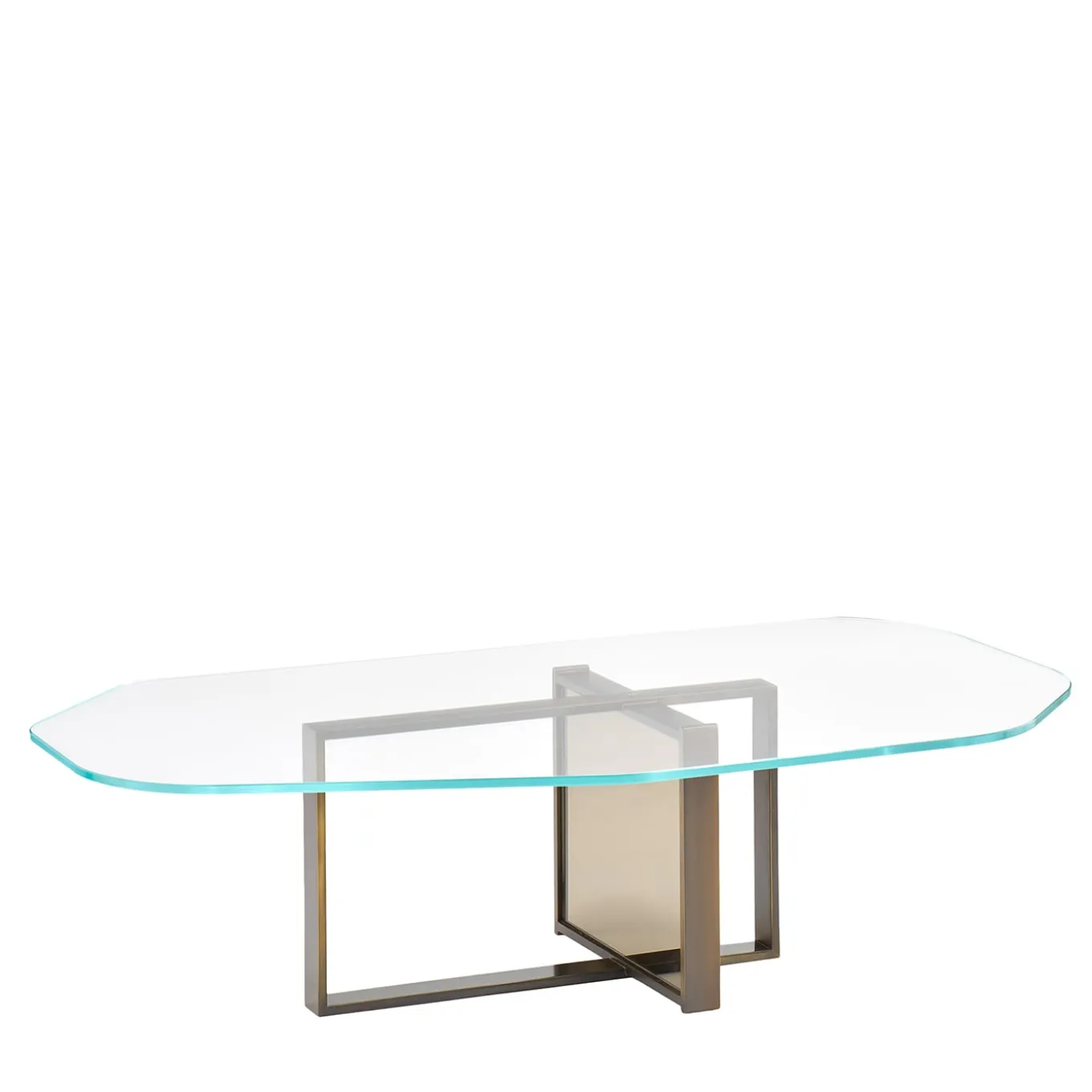 With its irregular tempered glass top and its bronze and cast glass base, the Cross Bar Table is akin to a vintage piece of jewelry, it accessorizes any space. Part of the Cubist Collection, the Cross Bar Table’s irregularly shaped top follows the theme of the collection of distorting the traditional and creating new forms. Smoke glass base with stainless steel frame in a dark bronze finish.