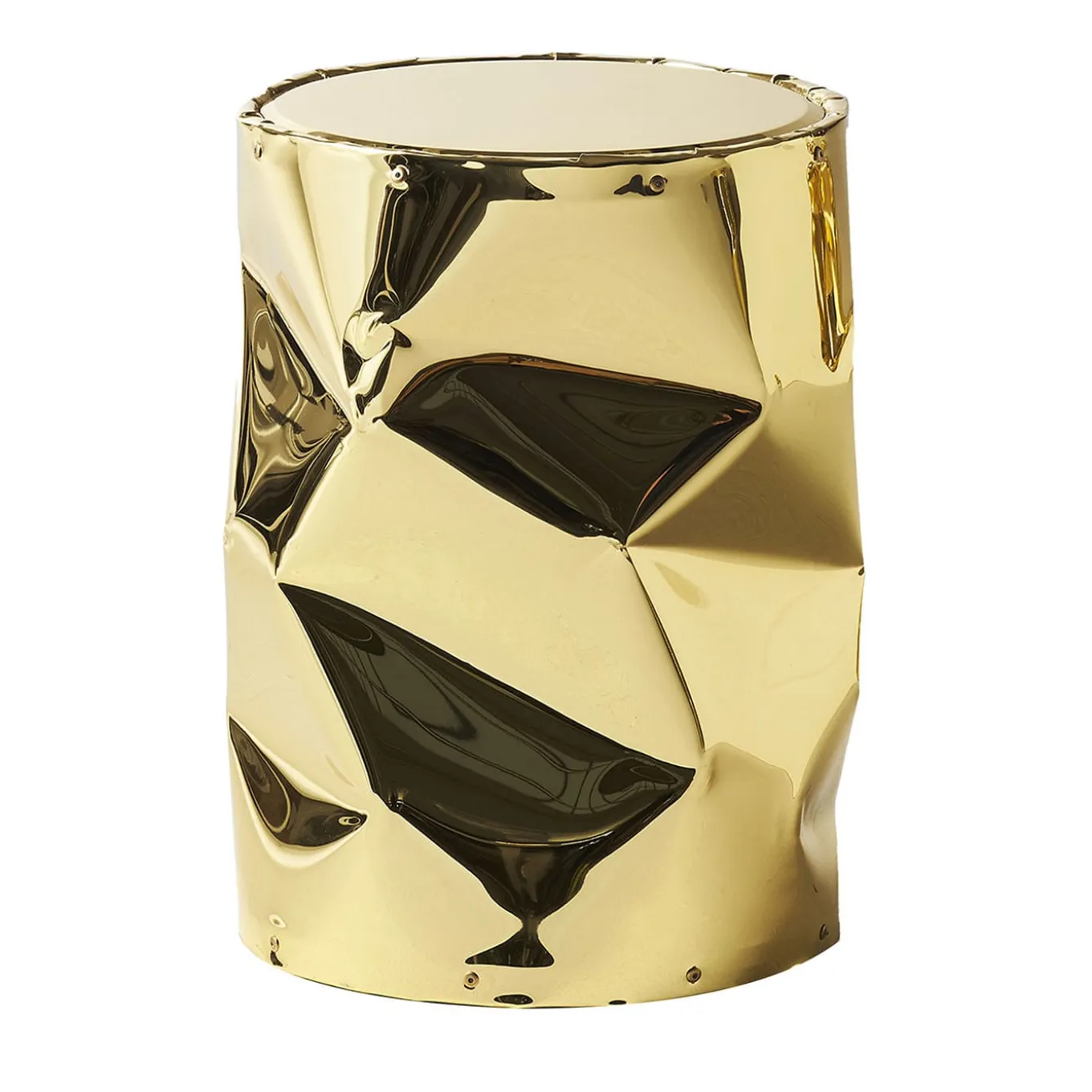 The Crumpled aluminium stool is a striking addition to any modern interior. Characterized by its unique, hand-crumpled aluminum design, this piece combines functionality with an avant-garde aesthetic. The gold finish adds a sophisticated touch, reflecting light beautifully and enhancing its contemporary appeal. Perfectly suited for various settings, this stool serves not only as seating but also as an eye-catching accent piece. The robust construction ensures durability while maintaining a lightweight profile, making it easy to move as needed. A bold choice to infuse any space with a sense of artistic flair.