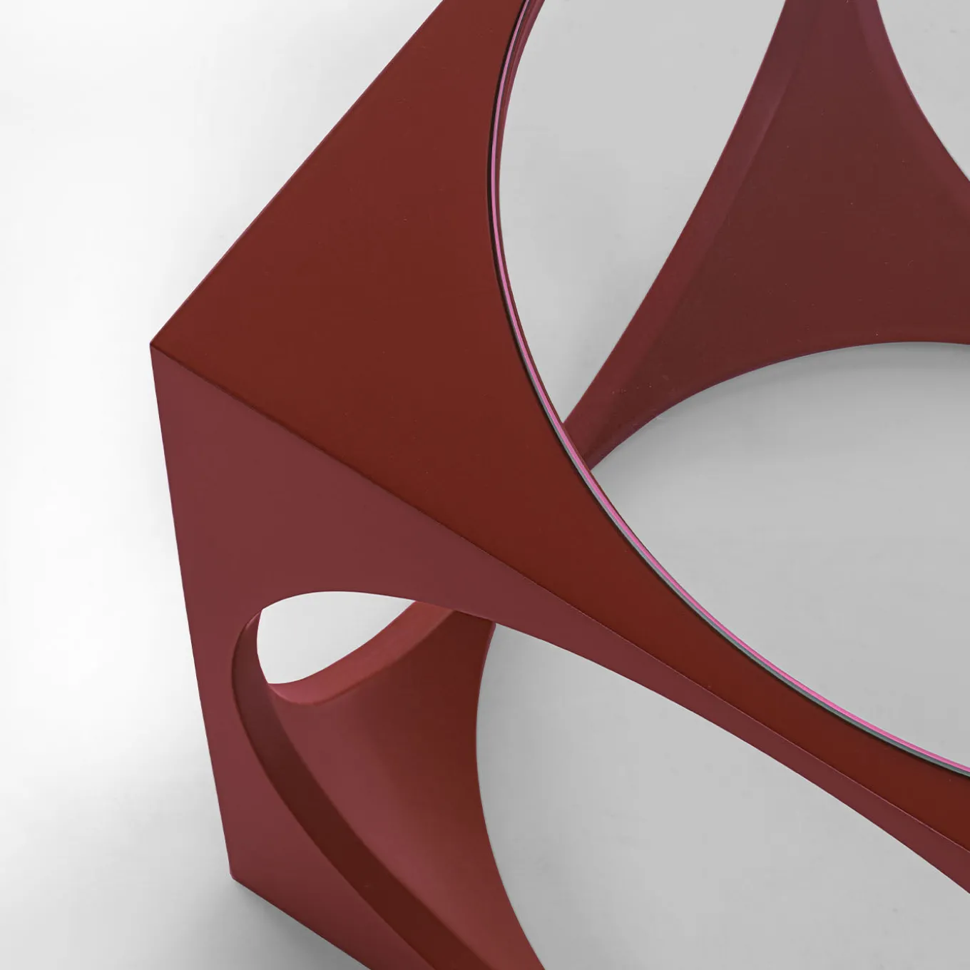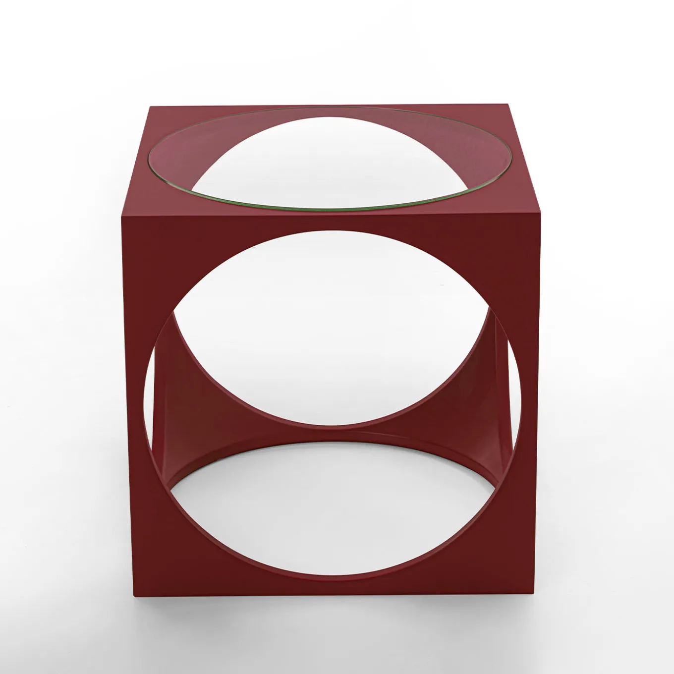 The Cubo Multiuso is a versatile piece, designed for modern or minimalist interiors. Its clean cubic shape features large circular cutouts on each side, creating a striking visual effect while maintaining an open, airy feel. Crafted with a red lacquered finish, the surface offers durability and a refined look, complemented by a clear crystal top that adds a subtle touch of elegance. This multifunctional cube can serve as a coffee table, bedside table, or decorative element, adaptable to various living spaces.