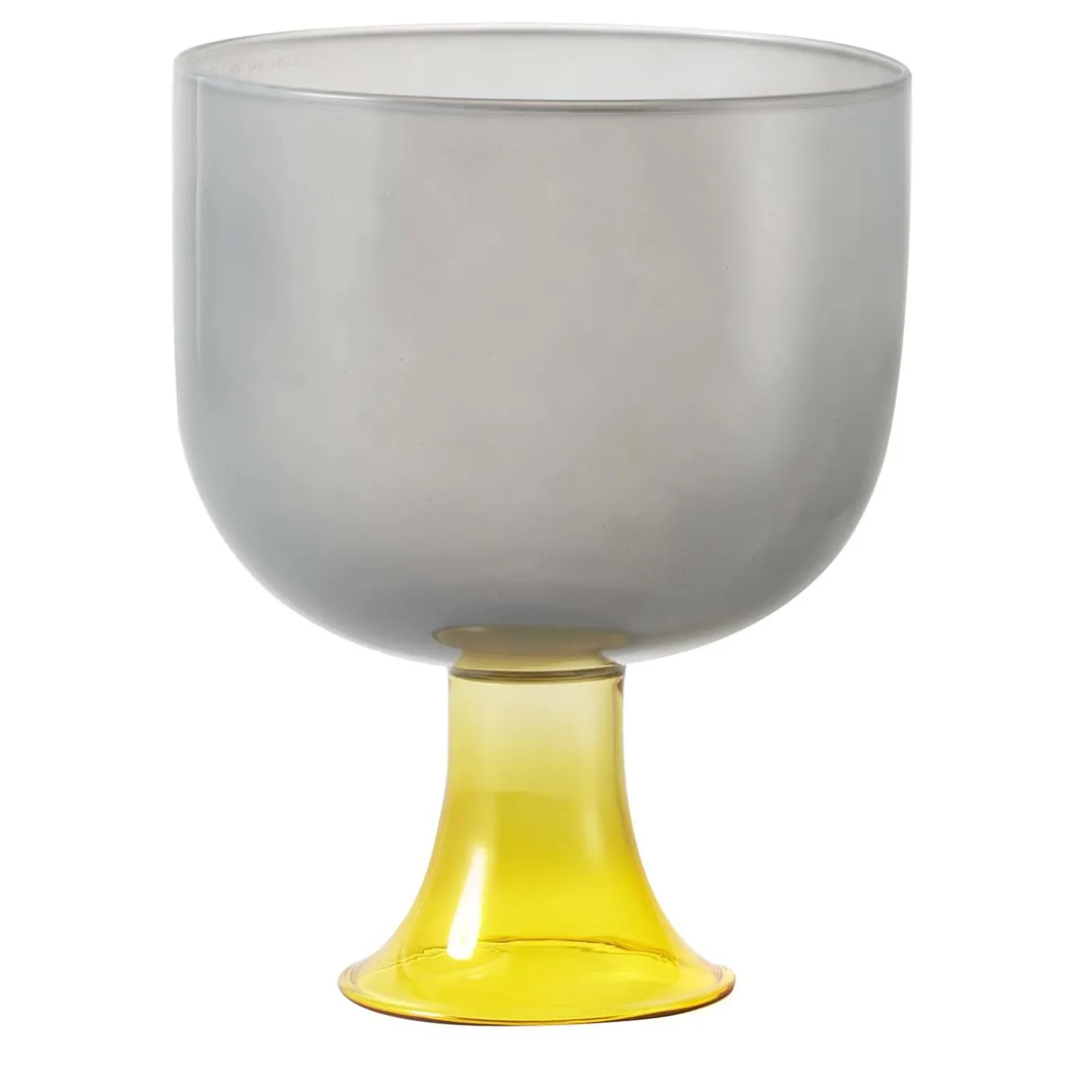 Charming and cheerful, this elegant yellow and gray blown glass goblet will make a delightful addition to your dining room glass ware. This beautiful cup may be used for a delectable dessert or for displaying candy and chocolates on your table.