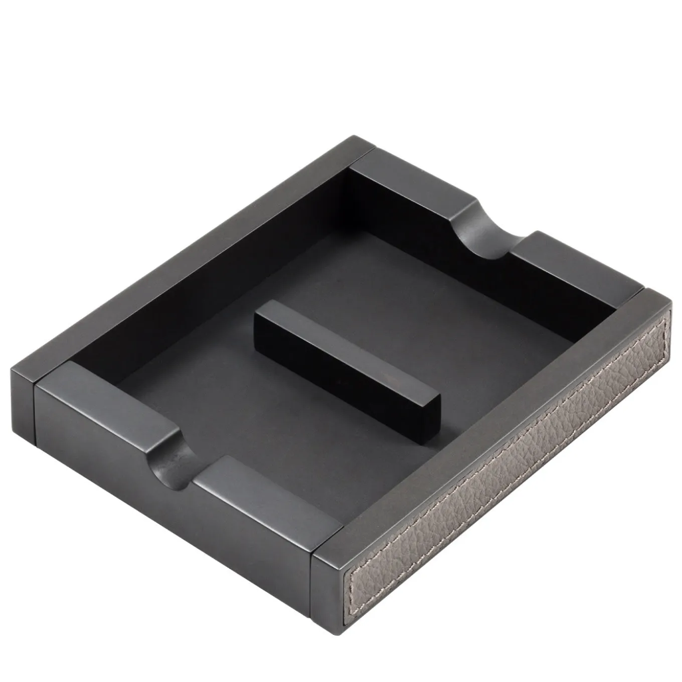 A stylish combination of aesthetic and functionality, this ashtray flaunts a minimalist design entirely carved from a solid metal block boasting a burnished bronze finish. Enriched with fine leather inserts showcasing handmade stitching, its rectangular silhouette features a space for cigars on one side and for cigarettes on the other, highlighted with a central divisor. Also available in burnished brass or polished chrome, please contact the Concierge for details.