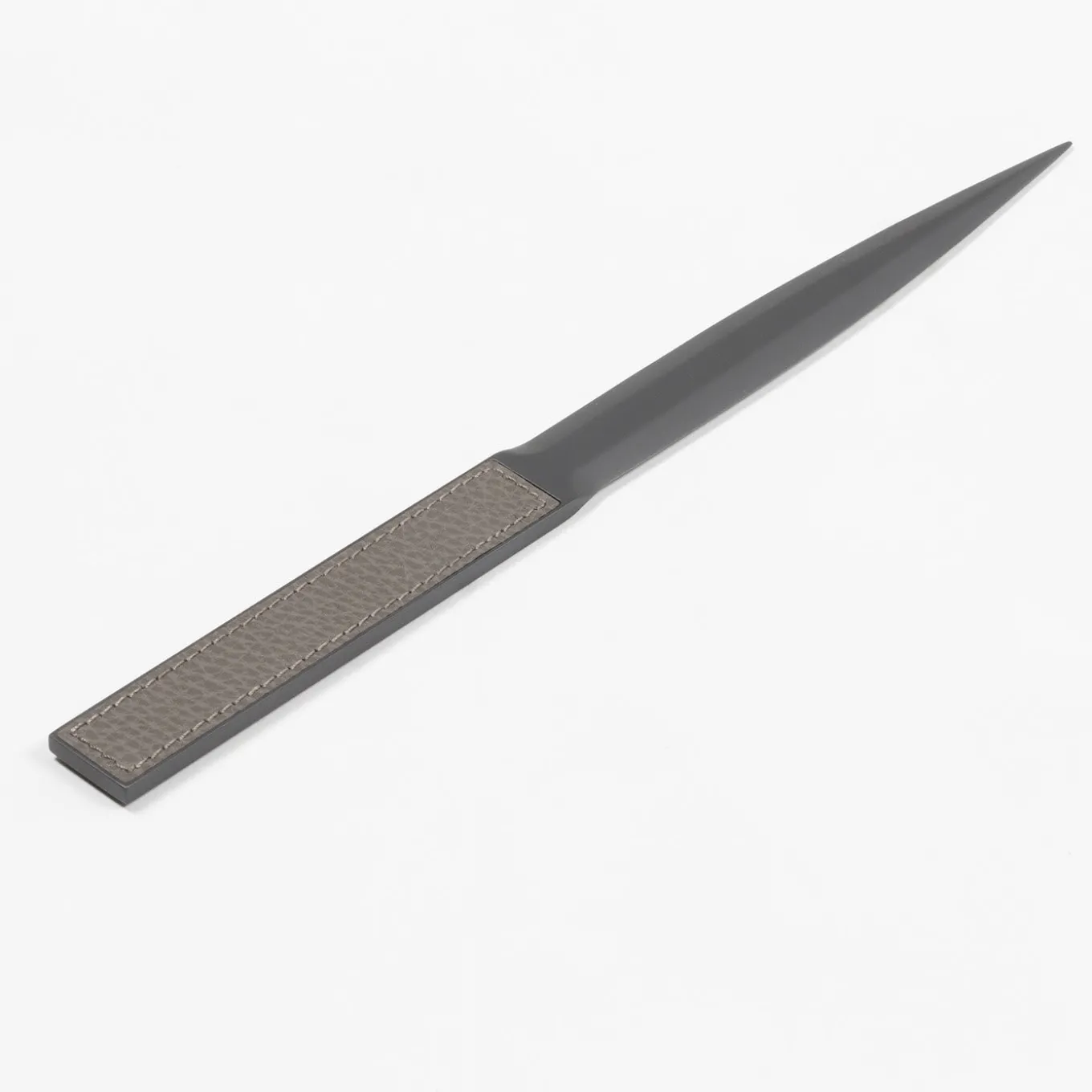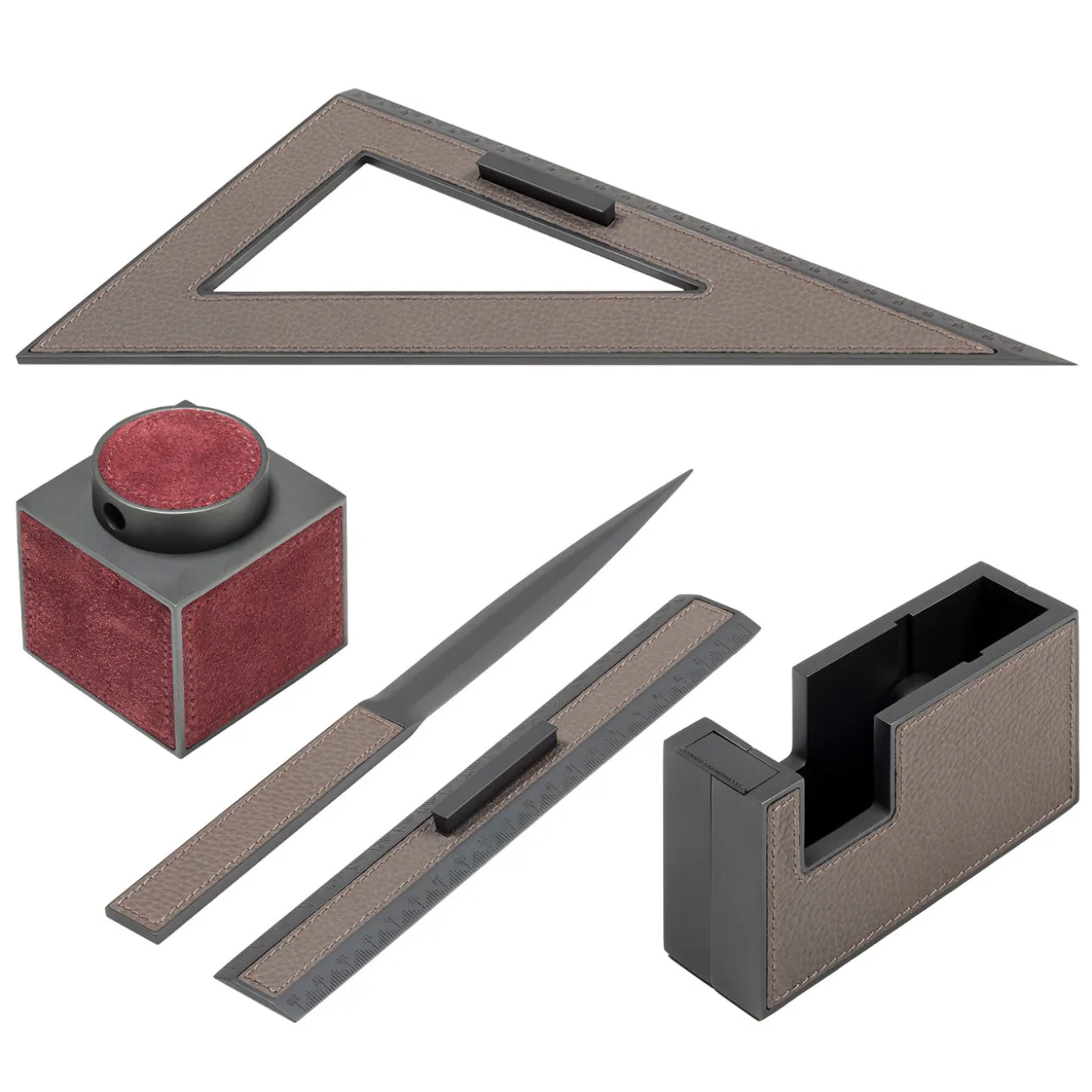 Exquisitely distinguished by a clean and essential design, this desk set will infuse subtle sophistication in any home office or study. Composed of a ruler, triangle ruler, pencil sharpener, paper-knife, and tape dispenser, each piece flaunts a sharp and bold geometric design carved from burnished bronze-finished metal, and enriched with refined leather inserts.