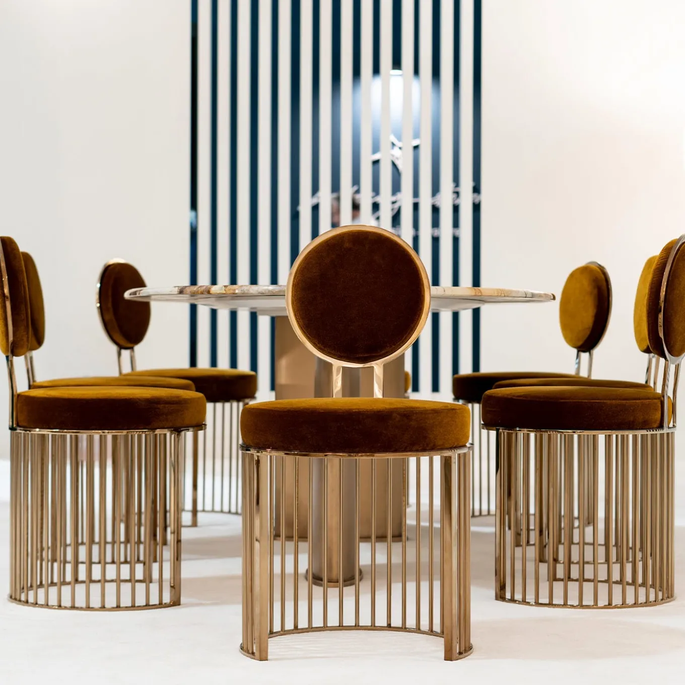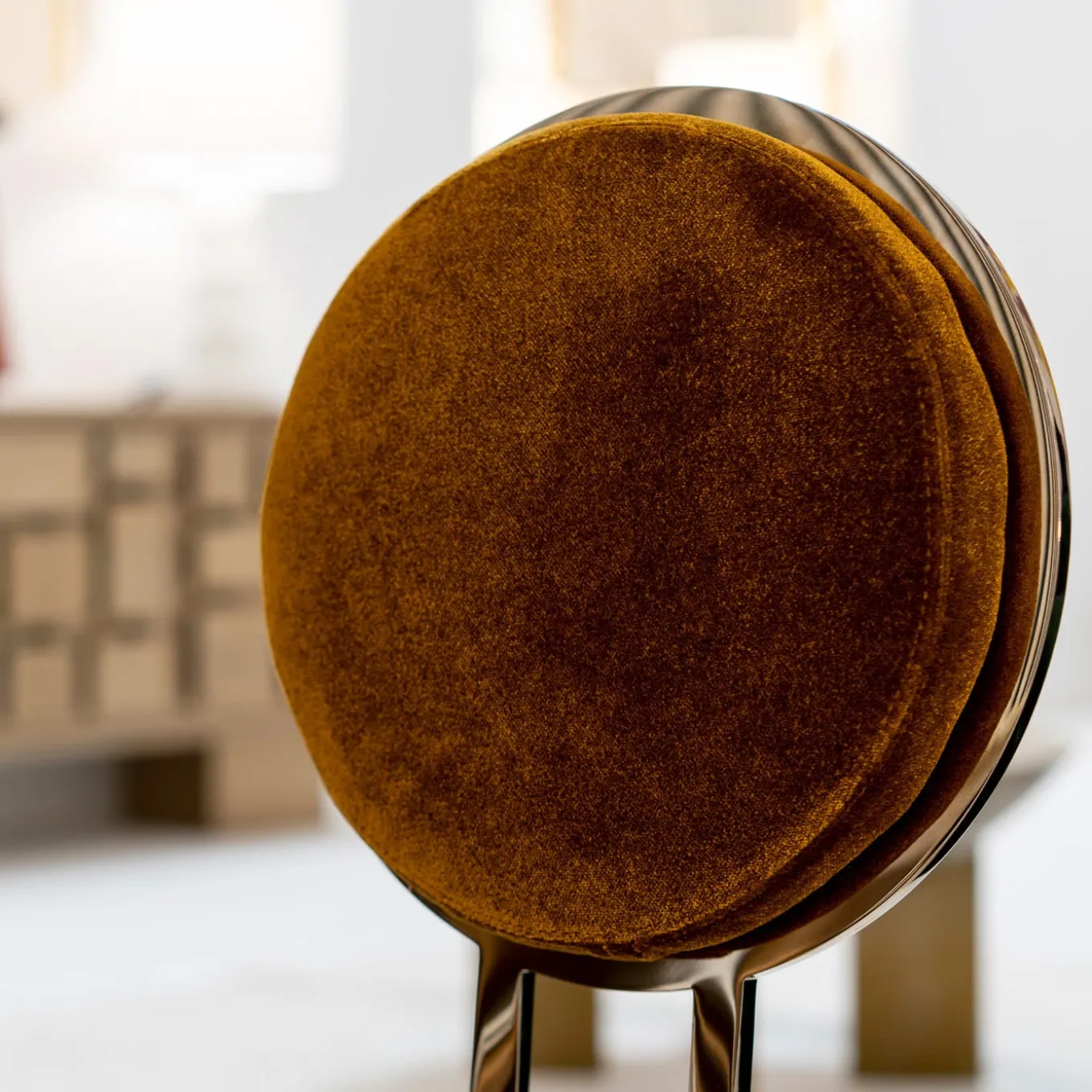 Style and refinement describe this gorgeous chair brimming with romantic vintage inspiration. It features a round seat and backrest, padded and upholstered with brown velvet, resting on a semi-circular series of dark gold-finished steel cylinders. Please consult with the Concierge for further information.