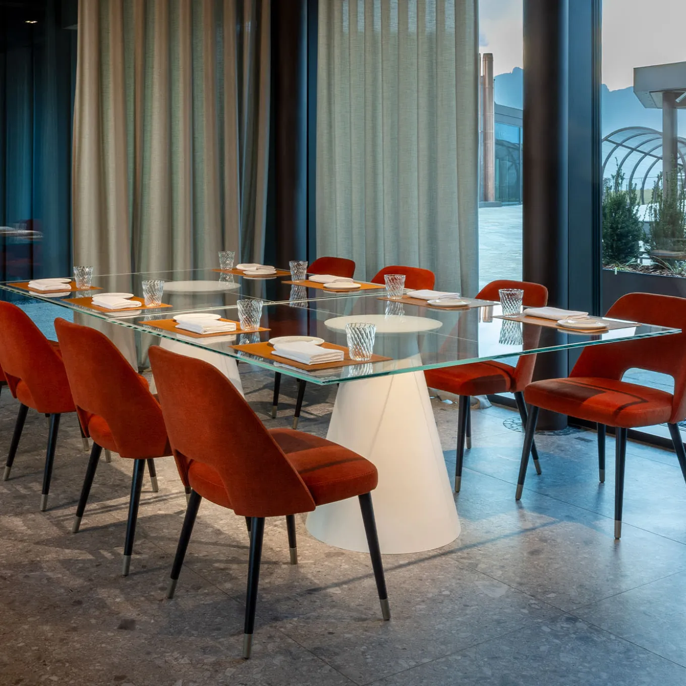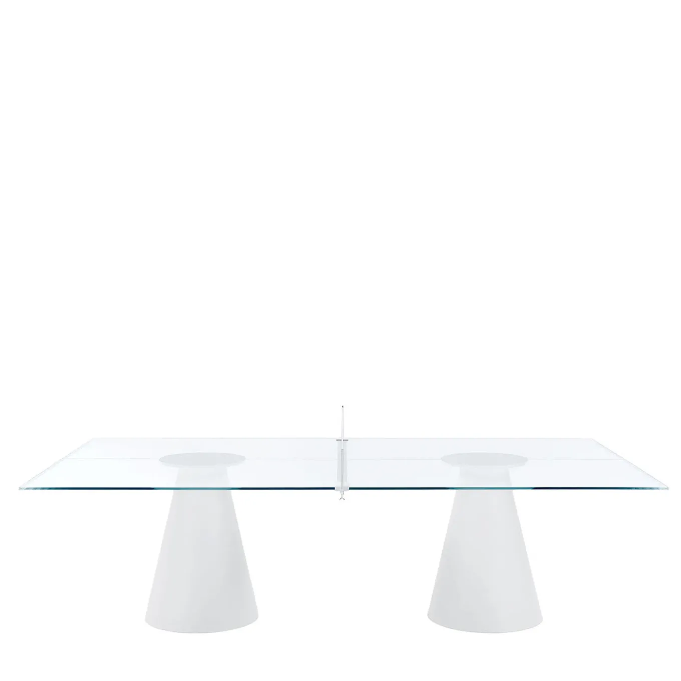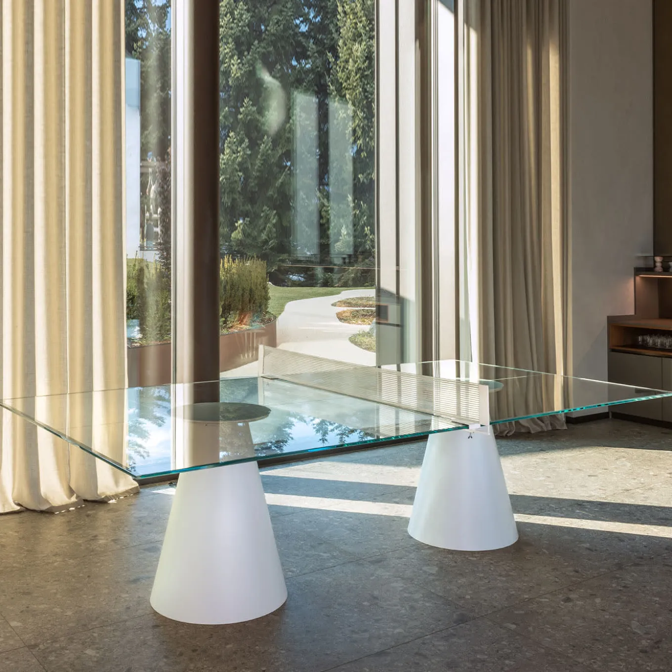 The Dada Glass ping pong table features iconic cone-shaped legs in white. It is characterized by a shiny transparent playing surface and a game lines screen-printed directly into the glass that make the table streamlined and elegant. It can be separated into two beautiful square glass tables. Accessories are included: 2 rackets and 6 balls.