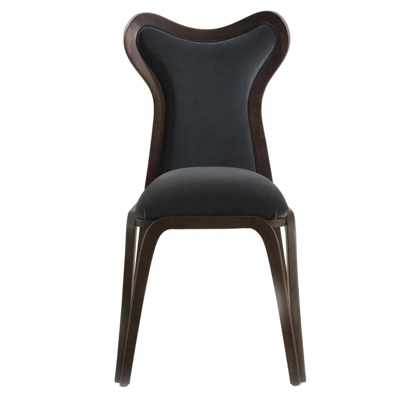 Introducing the Daina Chair by Nigel Coates. This chair emanates elegance and lightness with its structure, crafted from matte walnut wood, folding like a ribbon to create a stylized profile. The Daina Chair conceals its construction complexity and refined details beneath its surface. The folding structure cradles a velvety soft cushion in the middle and at the back. Embrace the artful blend of inspiration and craftsmanship with the Daina Chair—an icon of sophistication for your living space.