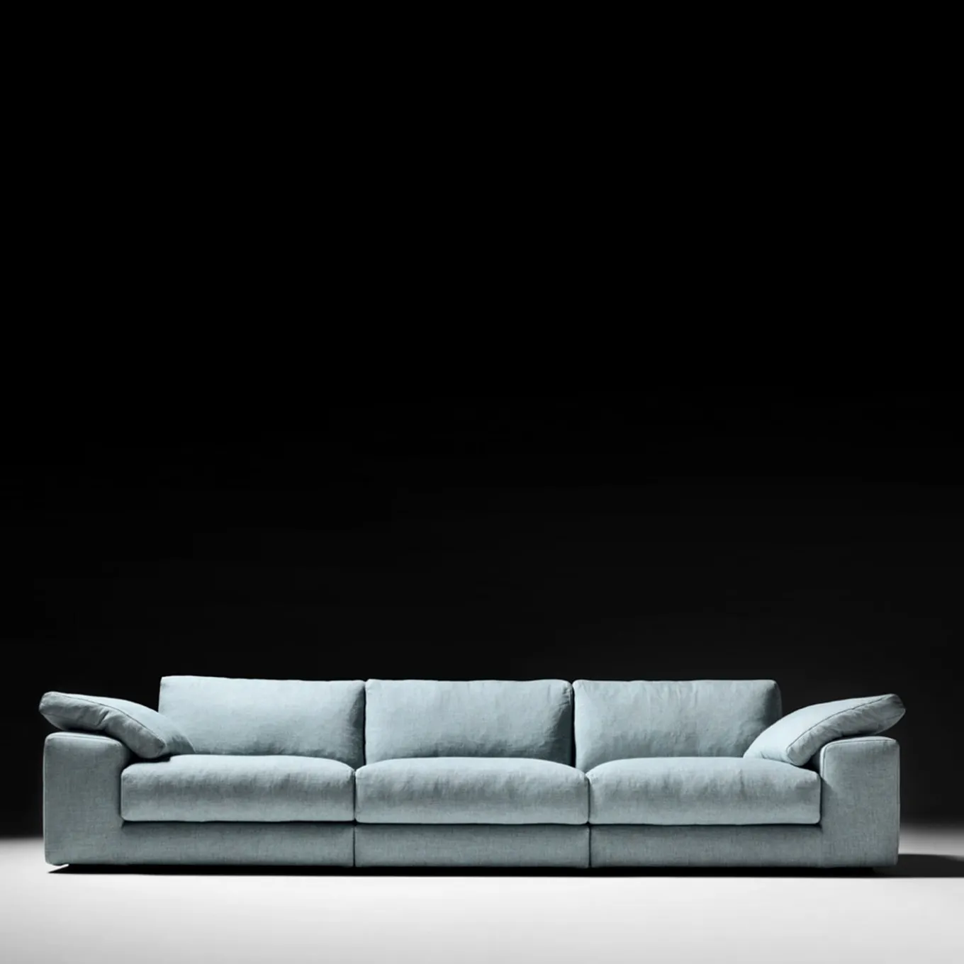 Boasting an elegant allure in its soft gray color and a simple yet imposing silhouette, this sofa comprises a structure made of poplar and fir, equipped with an elastic belt spring system, that is padded with a multi-density and highly-resistant polyurethane and memory foam covered with thermo-bonded fiber and flexible jersey fabric. The three cushions of seat and back are filled with 100% European goose feathers and 10% down. The fabric upholstery of this elegant piece is completely removable.