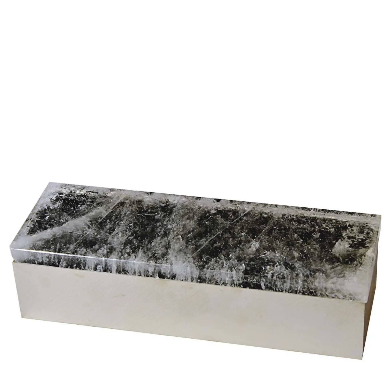 A mesmerizing display of modernist form and innovative design, this refined trinket box is a sophisticated addition to a personal collection. Fashioned of exquisite dark green quartz, an impressive lid rests atop a rectangular box in nickel-plated brass. The bold gray crystals and white striations dance within the dark green stone, the textured quality of the stone elegantly contrasting with the smooth brass surface.