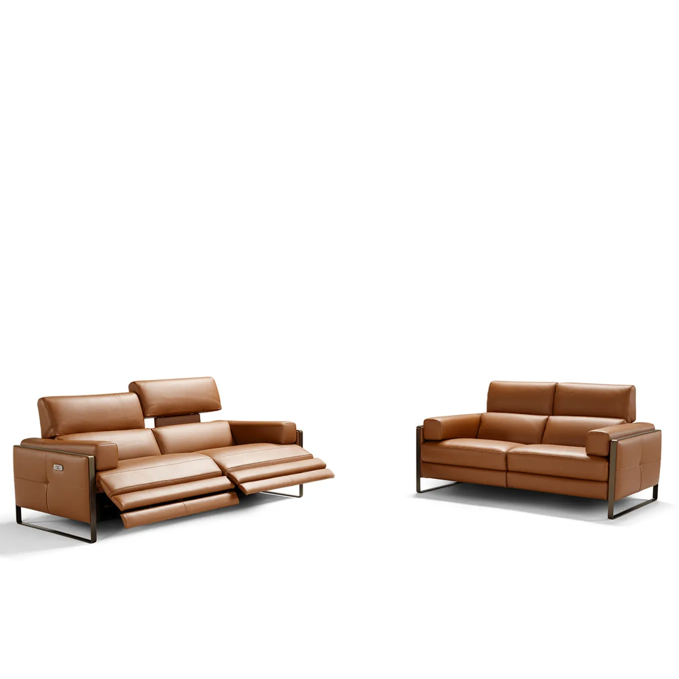 Synthesizing comfort and style, this three-seater sofa flaunts a fine leather upholstery in a warm shade of cognac brown. Its modular design consists of two seats linked by joints, whose headrests can be inclined manually or adjusted in height by means of an electric mechanism to settle the desired posture. The metal profiles surrounding the sides enlivened by an orthogonal quilted design function as structural support. The piece is entirely customizable, please contact the Concierge.