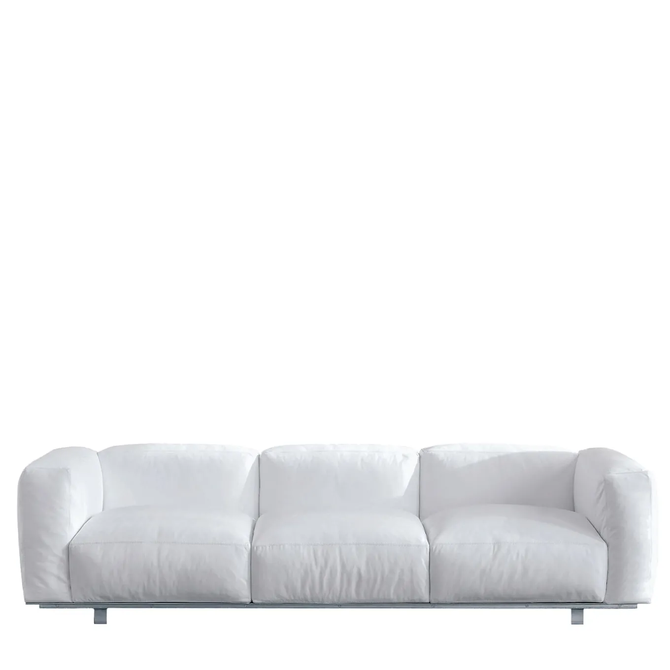 Mesmerizing in its flowing curves, this sofa designed by Giuseppe Bavuso evokes a sense of comfort and relaxation. Crafted with a wooden frame and cushions filled with differentiated-density polyurethane foam and sterilized feather quilting, this sofa ensures exceptional comfort. Supported by a chrome or painted steel base and legs, it seamlessly blends style with durability. Please explore size options with the Concierge.