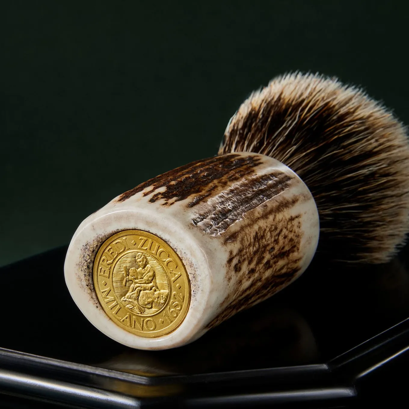 This accessory has been crafted with exceptional care for both materials and details, using the most prestigious of techniques that define the art of Italian craftsmanship. Boasting a harmonious silhouette, its luxurious deer horn handle is embellished with a brass Eredi Zucca medallion on the base. A comfortable grip and soft badger bristles make this professional brush a high-precision, robust and effortlessly functional tool.