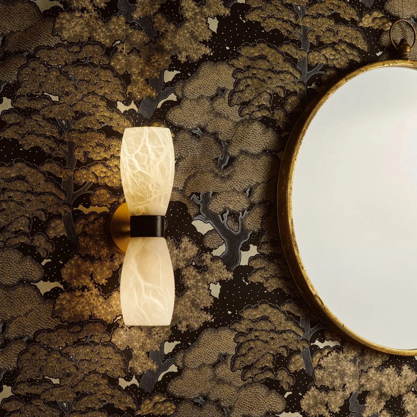 Demetra wall sconce, inspired by the mid-century style, combines the French gold and mat black finishes with alabaster to create a mesmerizing display. The ethereal glow emitted by the illuminated cups seems to hover in the air, casting a gentle, diffused light. Whether displayed individually or in a pair, these wall sconces showcase the vibrant richness of alabaster.
