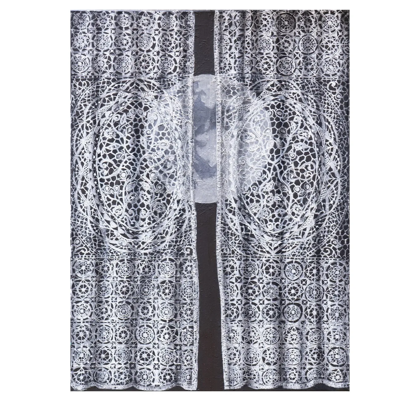 An oil on canvas painting offering a sensorial experience, where the intricate macramé lace pattern filters the view of a beautiful full moon on a winter night. The delicate texture of the lace contrasts with the serene glow of the moon, creating a dreamy atmosphere.