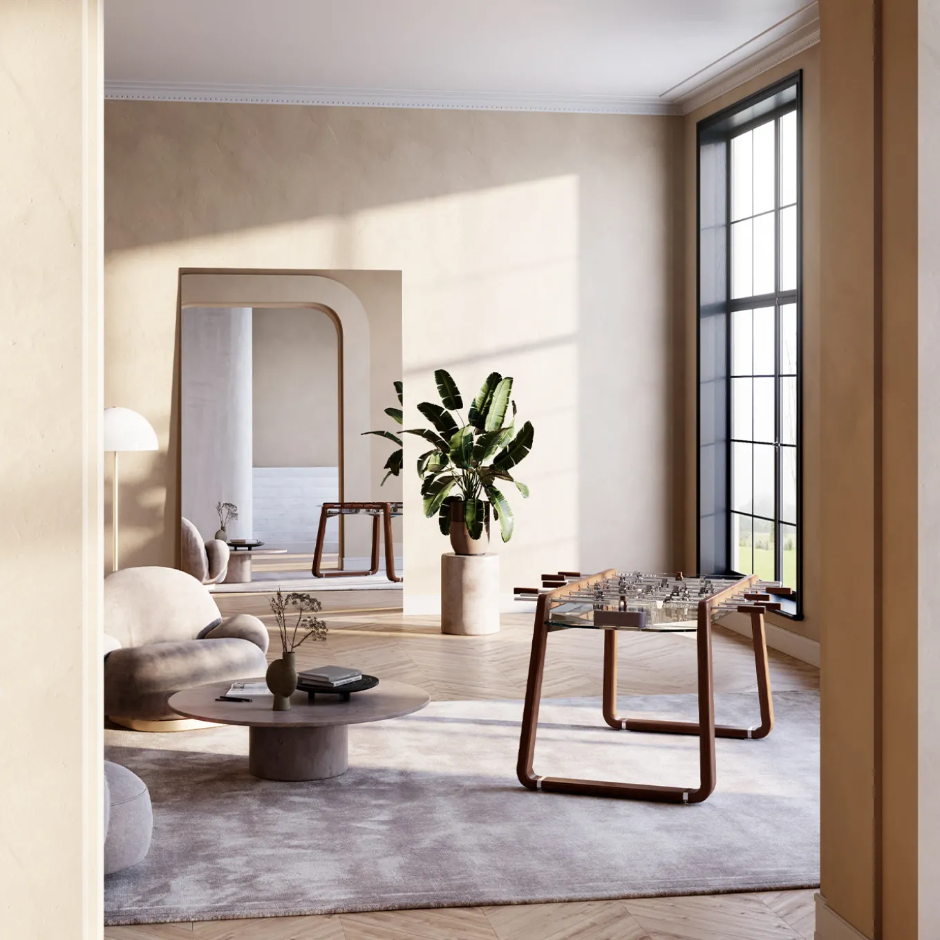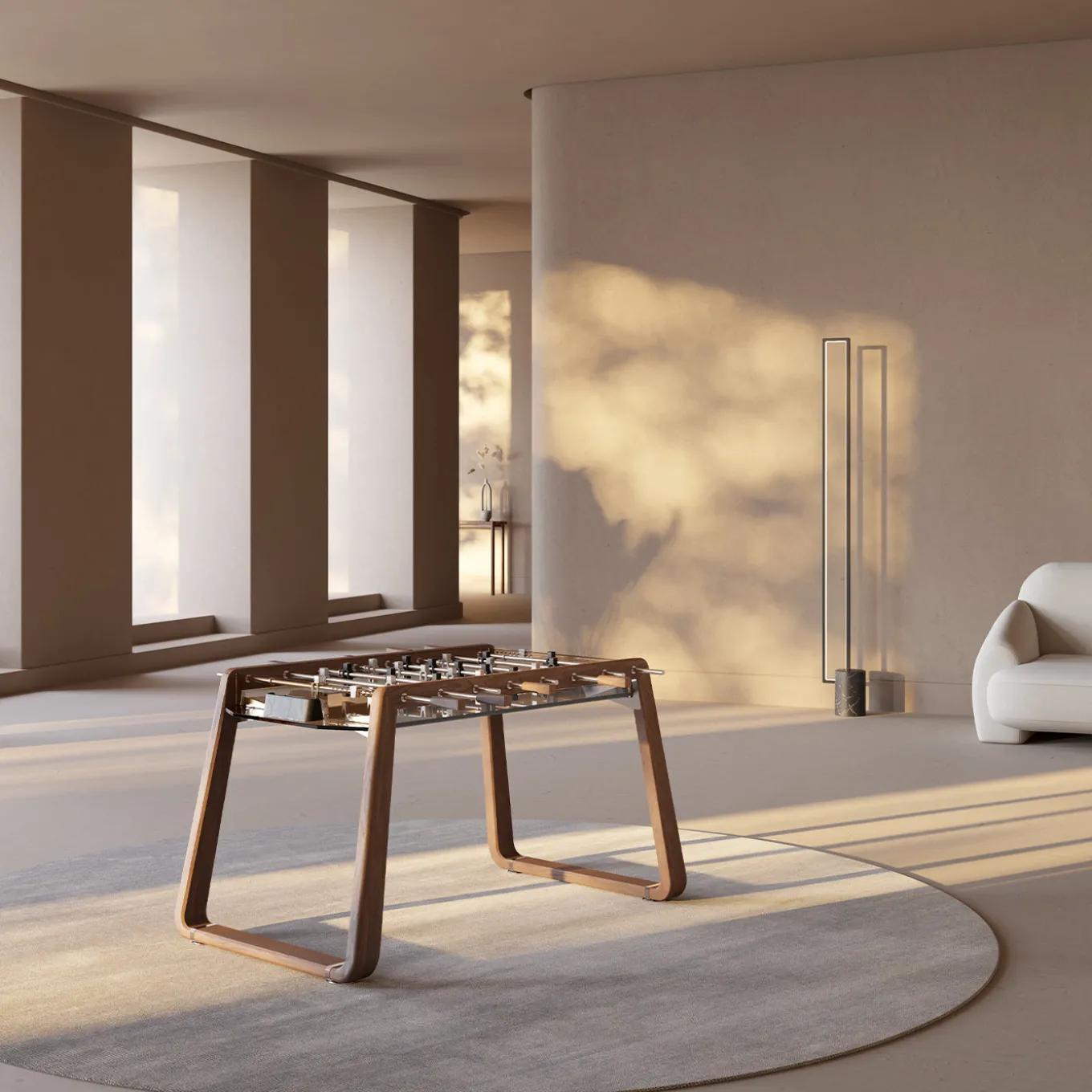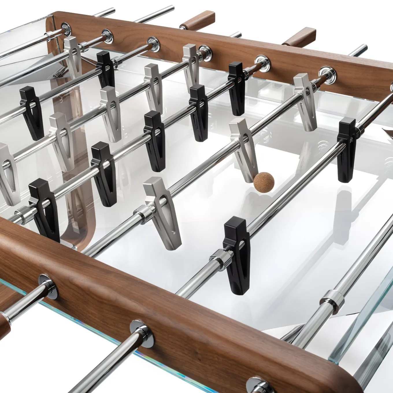 Derby walnut foosball table features a medium-sized playing field crafted from clear glass, supported by a contemporary frame in solid walnut wood with refined metal accents. Designed to balance innovation with exceptional craftsmanship, it elevates the traditional foosball experience while serving as a sophisticated centerpiece in any gaming space.