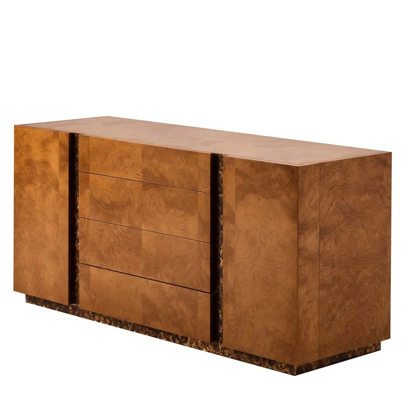 This luxurious buffet with myrtle briarwood veneer stained walnut is embellished with steel panels with an oxidized gold leaf finish. Exuding simple elegance, this piece features several practical drawers, each upholstered in canvas and equipped with soft close runners. With its sleek lines and streamlined silhouette, the Diadema Sideboard makes a versatile addition to a range of interior spaces.