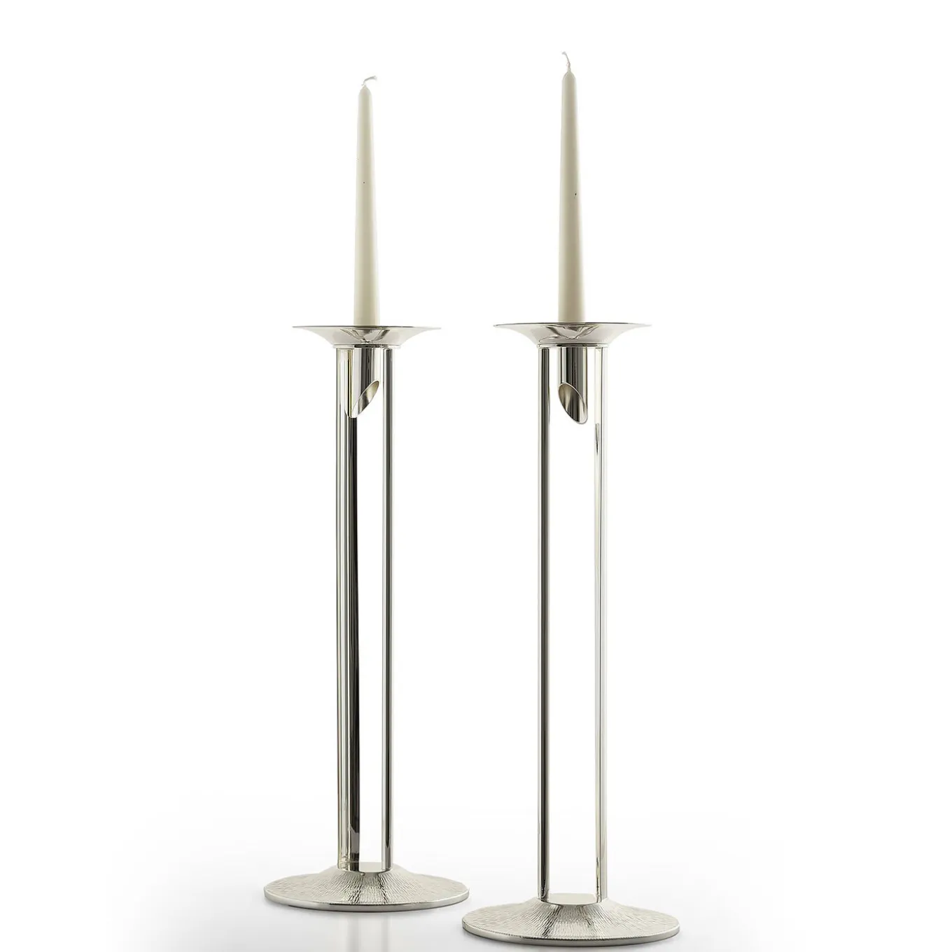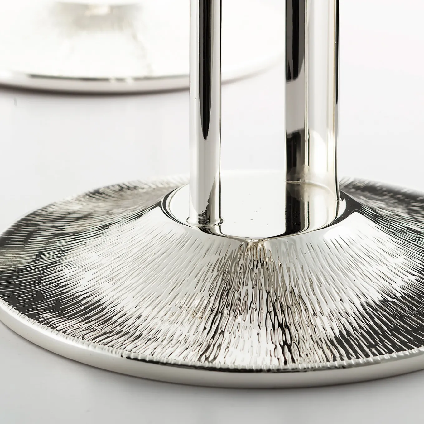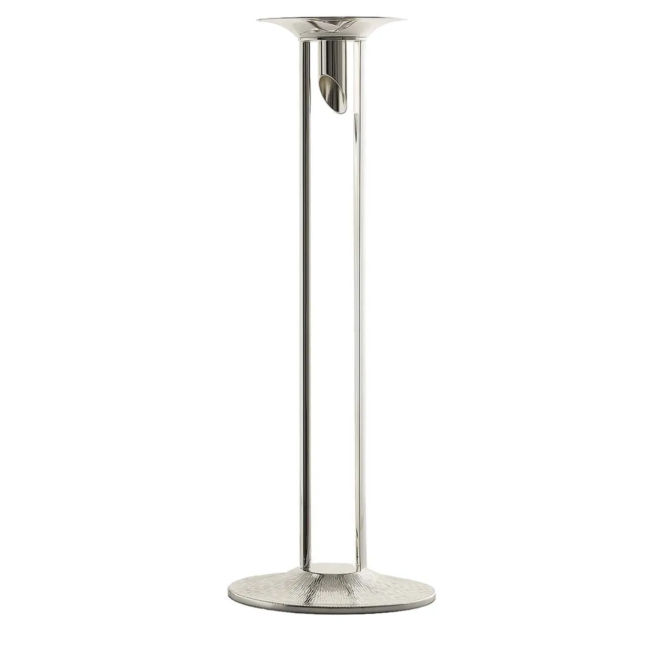 This candle holder boasts an exquisitely modern and innovative design. The structure rests on a round base that has been turned and subsequently hammered by hand. It is topped with two pieces of semi-curved parallel plates that create a wonderful interplay of light that reflect off the smooth and hammered surfaces. The candle sits on a small hammered tray with a circular seat cut at the end at a 45-degree angle. Paired with a candle or as a unique sculpture, this piece will have highly decorative value showcased in any interior surface.