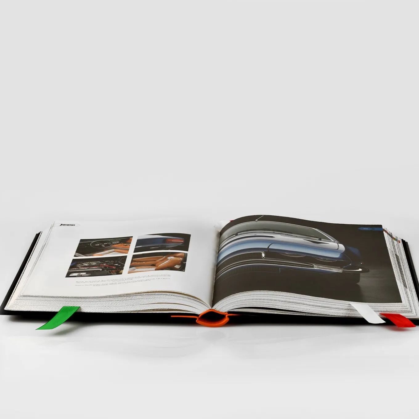 This book of unparalleled luxury celebrates the history of Lamborghini. Written by Antonio Ghini and illustrated by Mitja Borkert, it catalogs the models of the iconic car manufacturer since 1963. Printed in a limited edition of 250 pieces, each book was crafted entirely by hand by master artisans and comprises 317 hand-cut cotton-paper pages (210 gr) in English and Italian. The cover is in leather with a spine boasting the iconic Lamborghini-orange. The front shield is in 24k gold-plated bronze. Three satin bookmarks, silk-covered box, white gloves, and a cashmere cloth complete this piece.