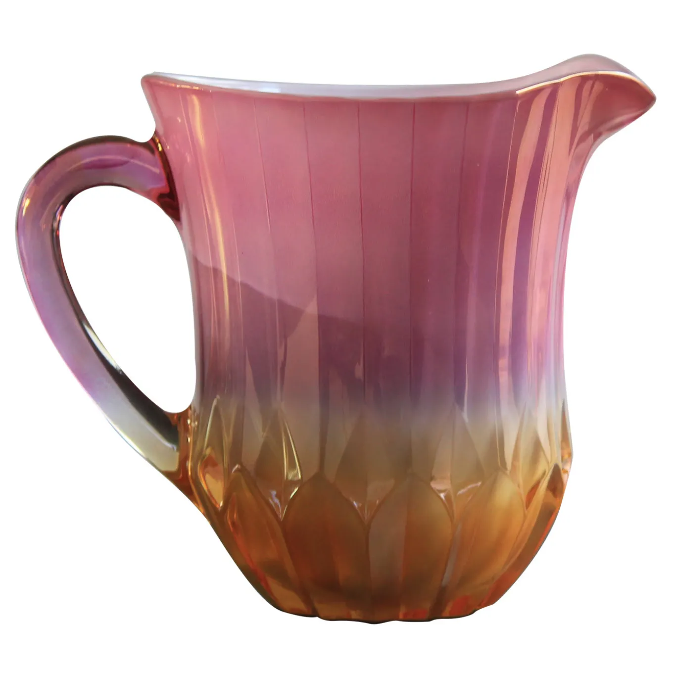 This captivating pitcher is a testament to glassmaking tradition and modern visual balance. Skillfully handcrafted of glass, it has a flared silhouette with a faceted, geometric base and vertically fluted sides that lead to a wide pouring rim and a curved handle. The white and orange color gradient of the glass pitcher elegantly contrasts with the multicolored glass handle, creating a dynamic color and textural contrast that gives the piece a unique, modern flair. This pitcher will add a refined touch of elegance for both everyday and festive table settings. It holds max 40 oz.