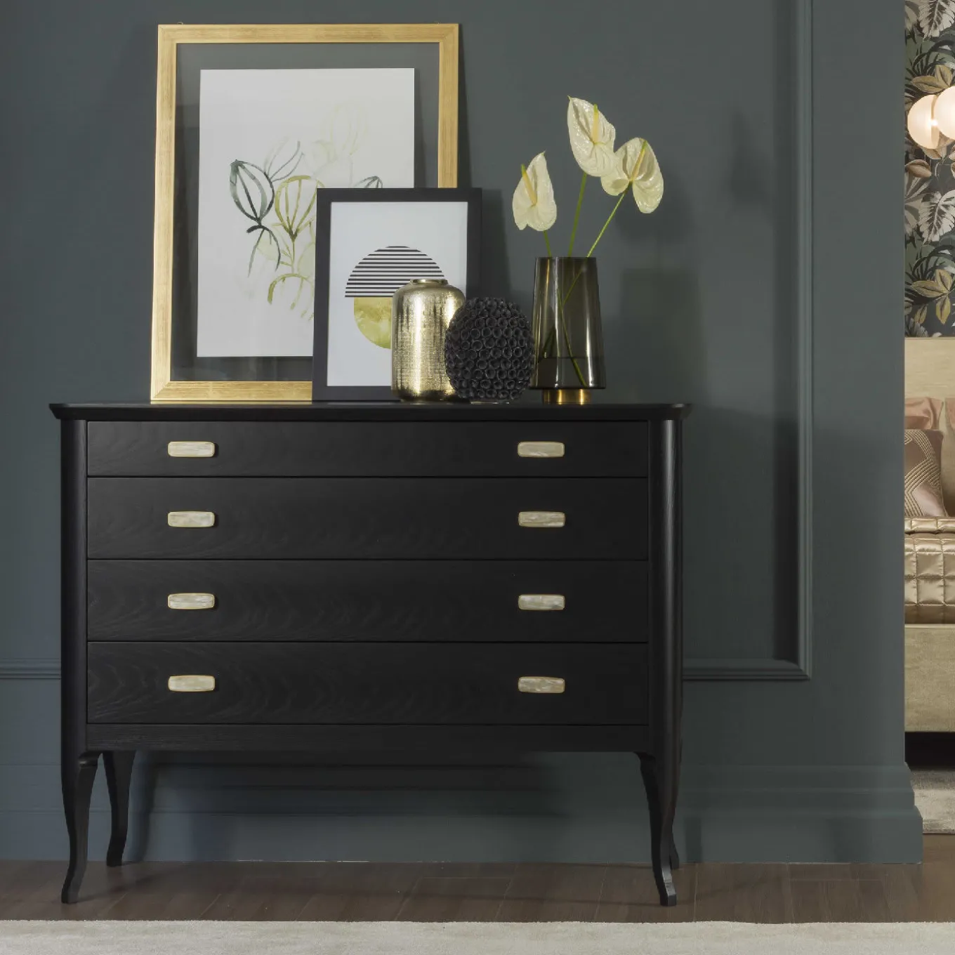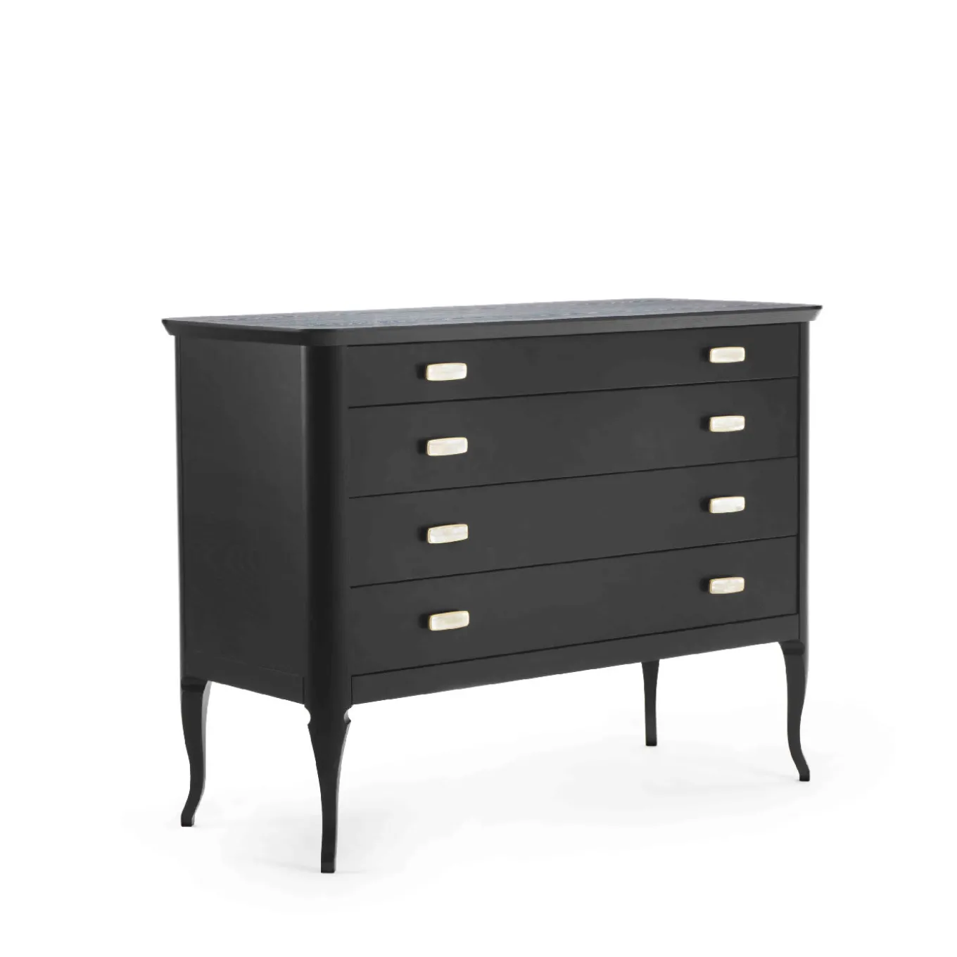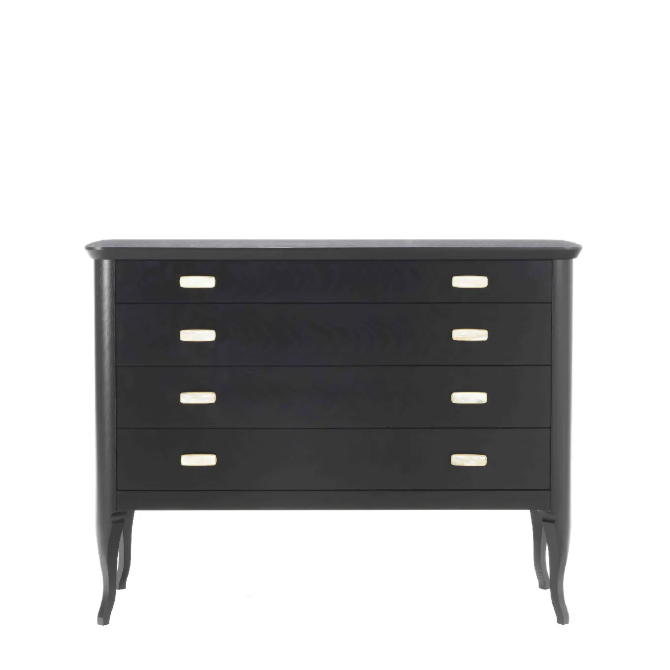Minimal aesthetic and functional design define this exquisite chest of drawers that will fit perfectly in a modern and classic living room or bedroom. Supported by an ash-veneered wooden frame with an ebonized finish, this dresser has rounded sides and a stunning top with extended, rounded rim supported by cabriole-style legs. Evoking the elegance of classic furniture, this piece showcases two elegant Art Deco brass handles with buffalo horn inserts on each of the four drawers featuring soft close Blumotion technology. This simple yet chic design will elevate the style of any interior decor.